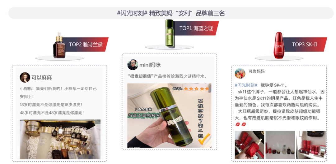 作为垂媒符合营销趋势的另一能力——契合内核,亲宝宝利用与用户关注点高度结合的内容/话题实现品类破圈和营销破圈的能力,不容忽略。如在美妆话题#闪光时刻#中,亲宝宝号召精致美妈进行护肤“安利”,与用户共建美妆内容生态的同时,品类营销也自然地由母婴拓展至美妆护肤。