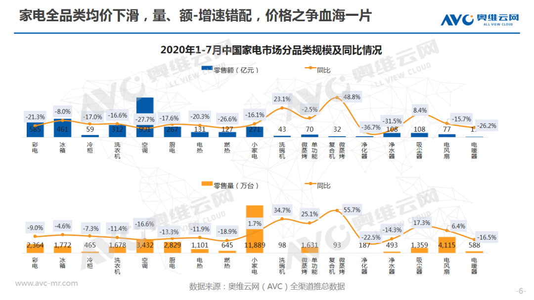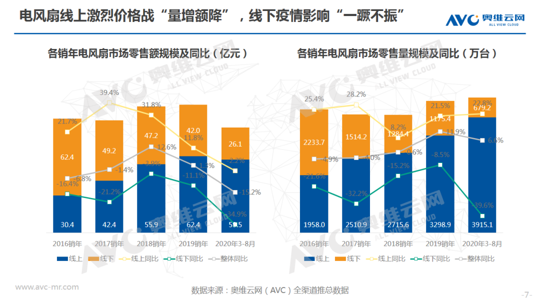 在互联网高速发展的大背景下,叠加上半年疫情影响,电风扇品类整体市场零售额规模出现下降,而零售量呈现个位数的增长。据奥维云网(AVC)全渠道推总数据显示,2020年3-8月,电风扇整体市场零售额规模85.6亿元,同比下降15.2%,零售量规模4594万台,同比提升6.6%。
