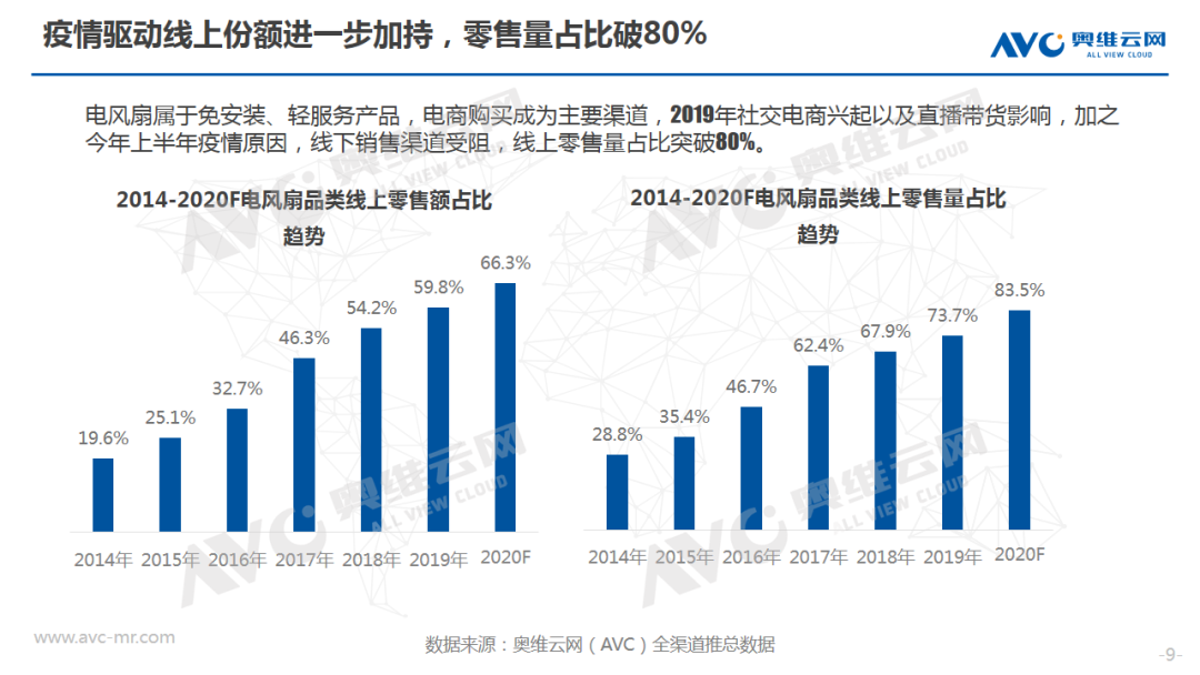 电风扇属于免安装、轻服务产品,电商购买成为主要渠道,社交电商兴起以及直播带货影响,加之今年上半年疫情原因,线下销售渠道受阻,预计2020销年线上零售量占比突破80%。