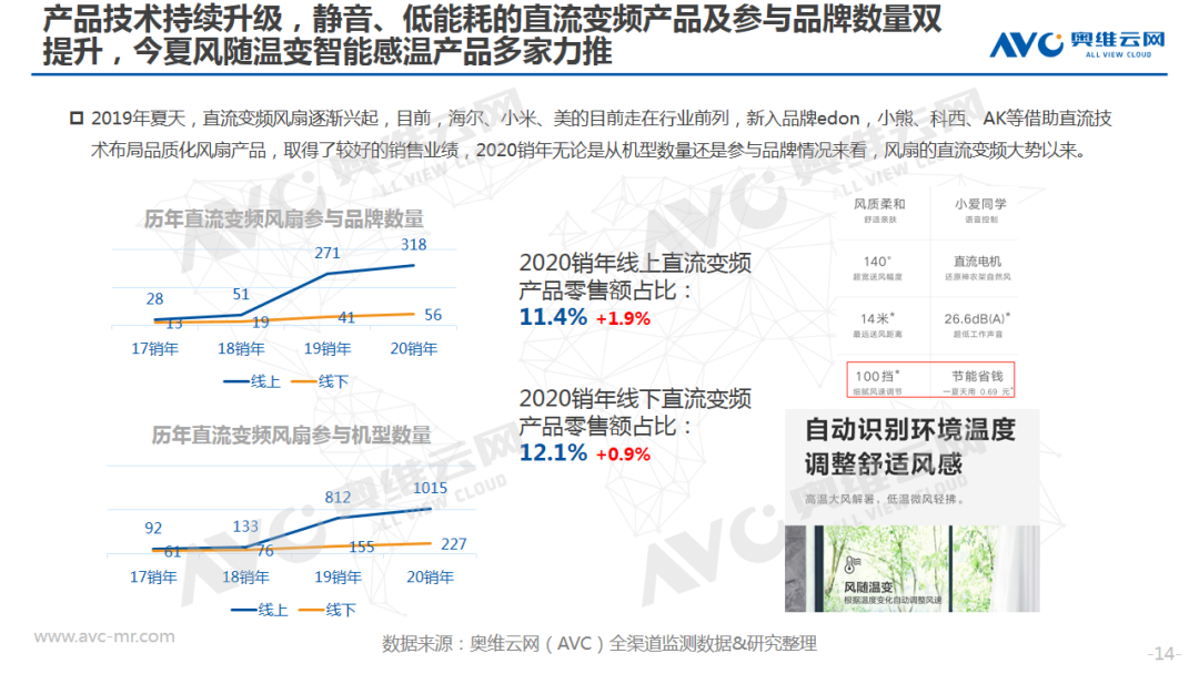 五、产品技术持续升级,静音、低能耗的直流变频产品及参与品牌数量双提升,今夏风随温变智能感温产品多家力推