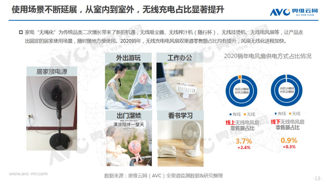 风扇的无线化打破传统围绕电源插口使用场景的局限性,提升了产品的使用便捷性,无线便捷化带动使用场景的延伸,为品类增长提供动力。