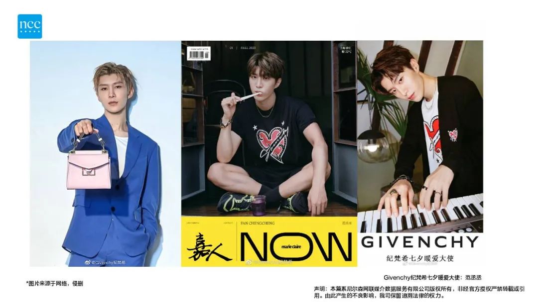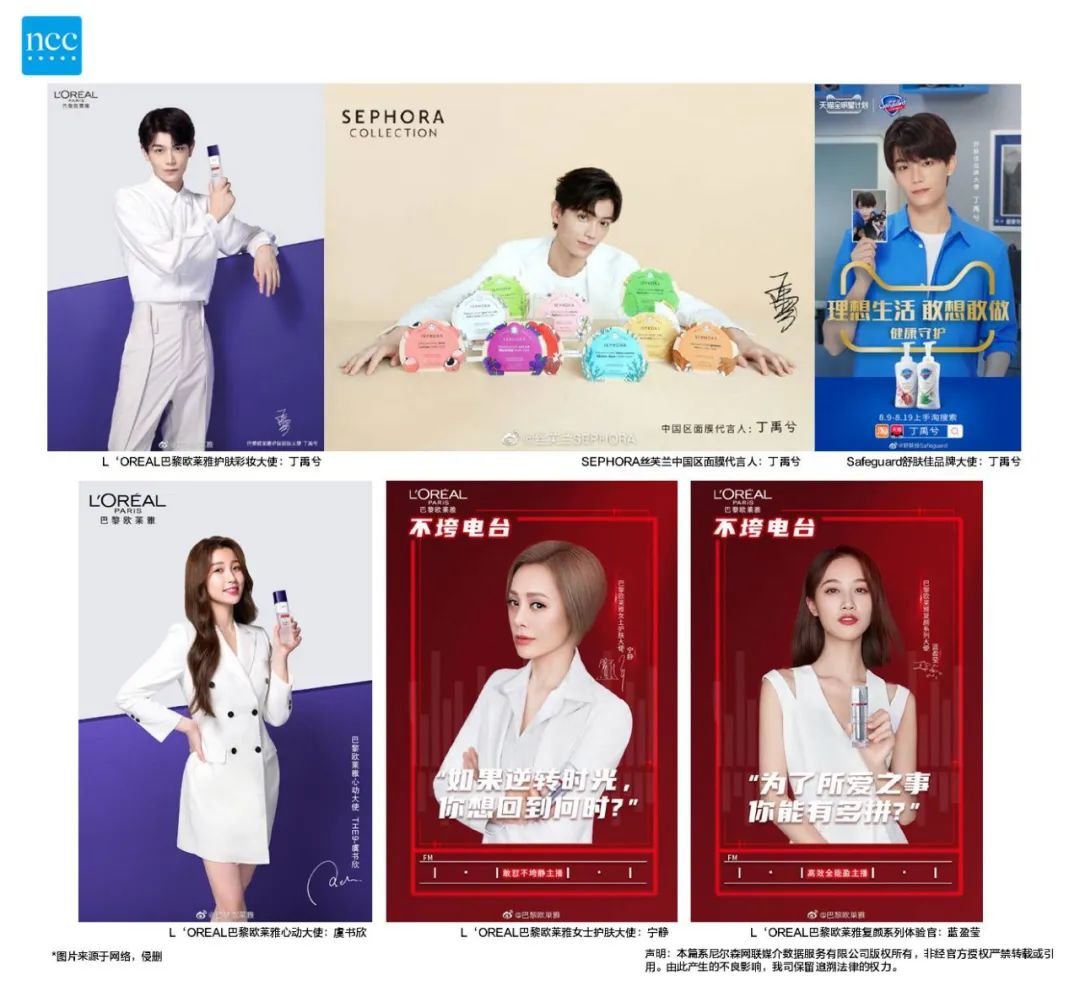 整体来看,该行业的用户年龄跨度相对较大,且用户群体的差异化也比较明显,大多数品牌都会根据不同产品类型和用户群体细分代言人。例如L’OREAL巴黎欧莱雅在本月除了官宣丁禹兮为护肤彩妆大使以外,同期还官宣了虞书欣为心动大使、宁静为女士护肤大师以及蓝盈莹为复颜系列体验官。不同年龄层的艺人所吸引的粉丝群体也不尽相同,选择多位不同年龄的代言人能够更好地帮助品牌扩大产品营销的辐射面积。
