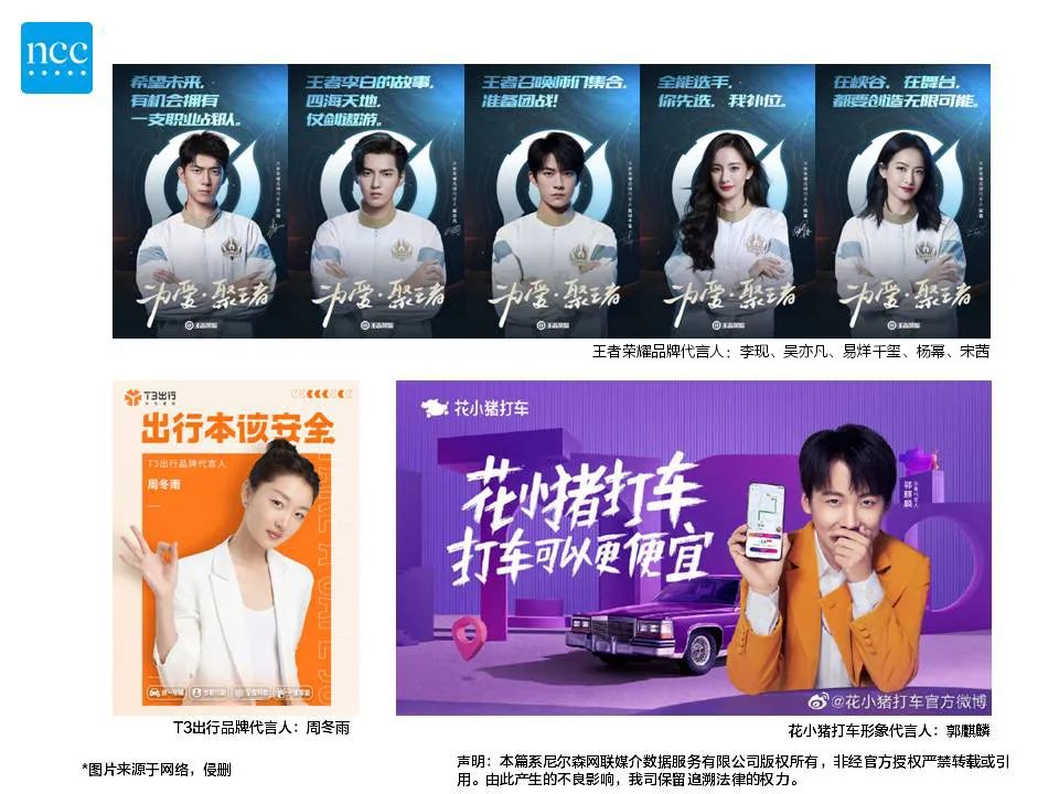 同时,以多款打车/出行类手机软件为代表的生活类APP,也乐于借助明星的流量引流,促进用户下载量和使用量的增长。例如T3出行APP在本月官宣周冬雨成为品牌代言人,花小猪打车选择当前综艺热门人选郭麒麟作为形象代言人。