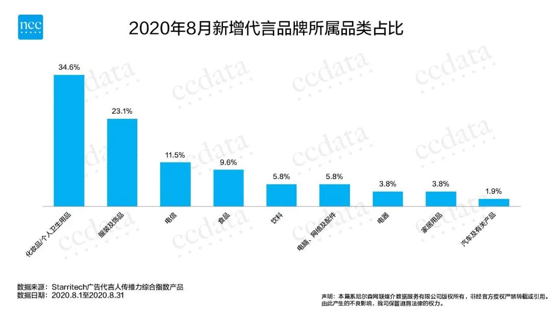 2020年8月,各行业在暑期迎来飞速发展,广告代言机会随之增多,新增代言需求尤其旺盛。对比7月代言市场表现,化妆品/个人卫生用品和服装及饰品依旧稳定领先,占比较上月均有所提升,食品品类在本月也有显著增多。