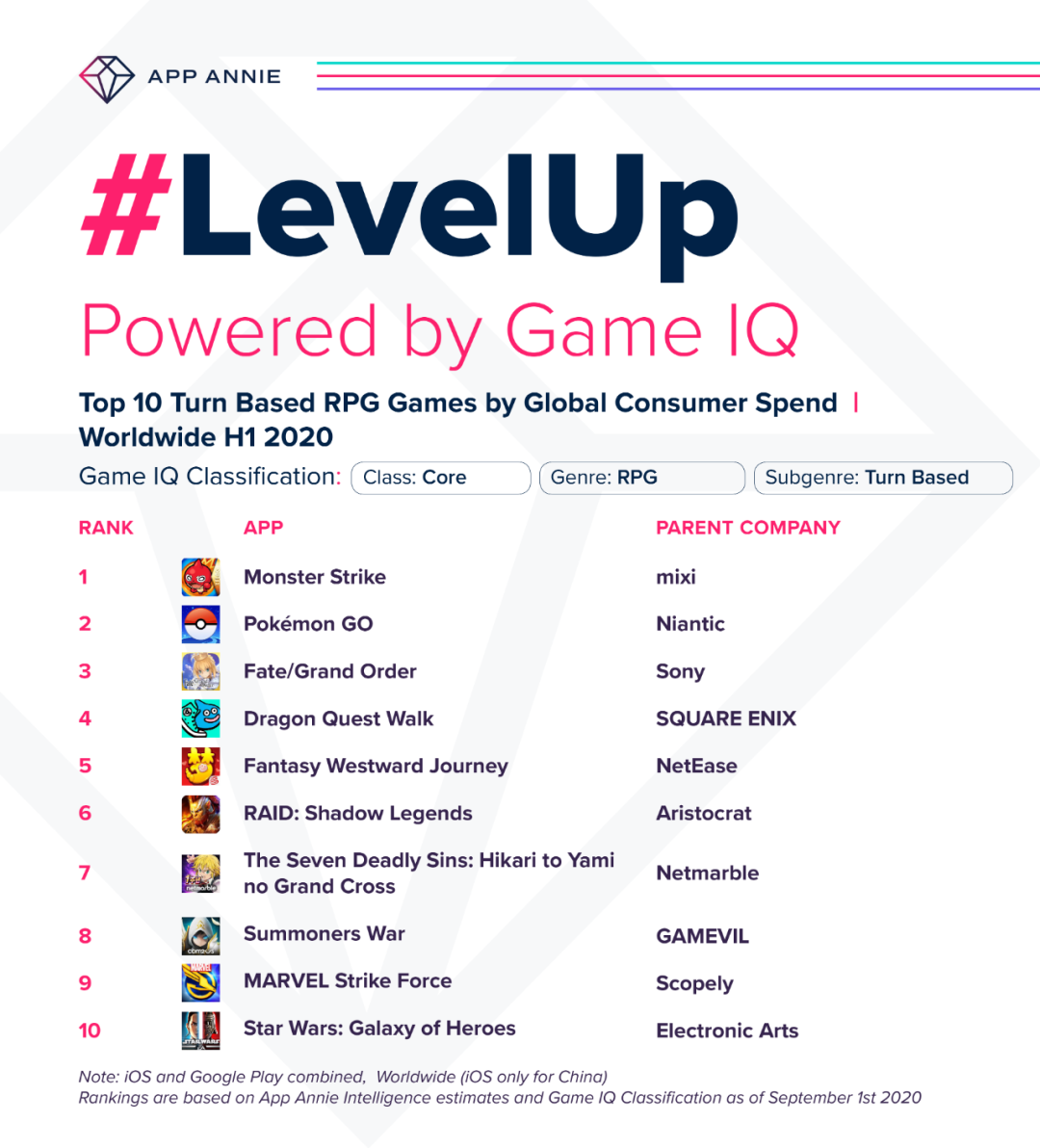 App Annie:2020 年上半年角色扮演游戏、博彩游戏前十强 App Annie 基于最新游戏分析产品 Game IQ,今日发布 2020 年上半年角色扮演游戏和博彩游戏榜单如下。 回合制角色扮演游戏 全球用户支出前十强 及其母公司 受众:硬核 分类:角色扮演 子分类:回合制 博彩游戏 全球下载量前十强 及其分类和子分类 受众:博彩 更多阅读:App Annie:2020 中国游戏出海驱动力App Annie:2020年第三季度日本市场游戏下载十强(3款中国游戏上榜)App Annie:2020 后疫情时代游戏行业观察App Annie:2021年2月中国厂商及应用出海收入30强App Annie:2020年移动市场年终盘点App Annie:2020年9月全球热门游戏及应用Top 10排行榜App Annie:2020年第一季度中国出海游戏收入排行榜App Annie :2020 年第二季度全球移动游戏指数排行榜App Annie :2020 年 9 月中国厂商及应用出海收入 30 强App Annie:2019年5月中国出海发行商收入排行榜单App Annie:详解最新日本手游市场趋势App Annie:2020 年 1 月中国发行商出海收入排行榜App Annie :2019 年主要移动游戏趋势探讨App Annie:2018年12月发行商出海收入排行榜App Annie :日本移动游戏市场大有可为