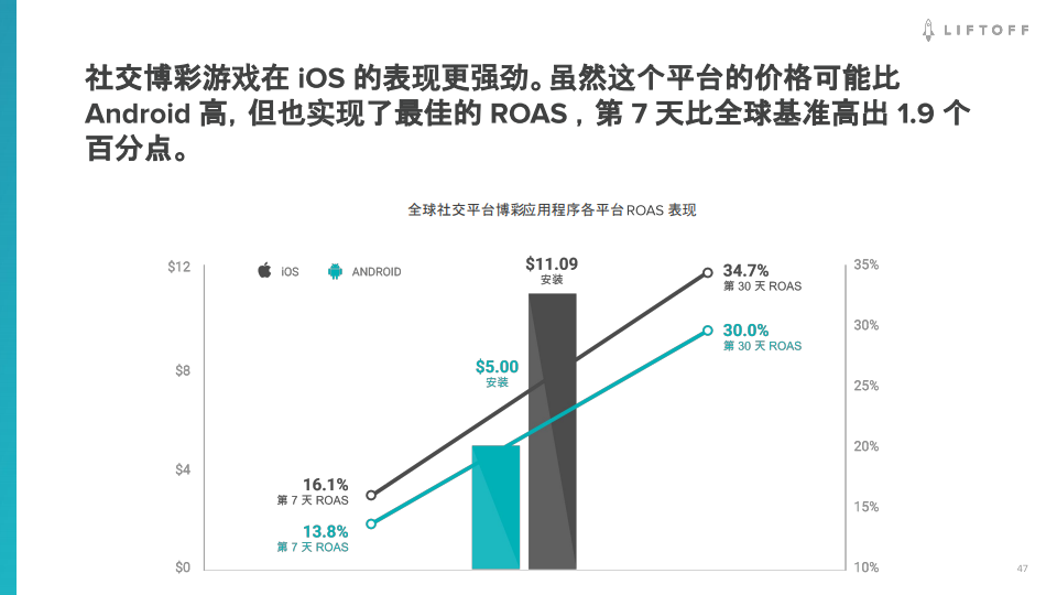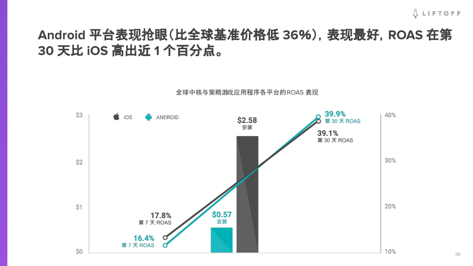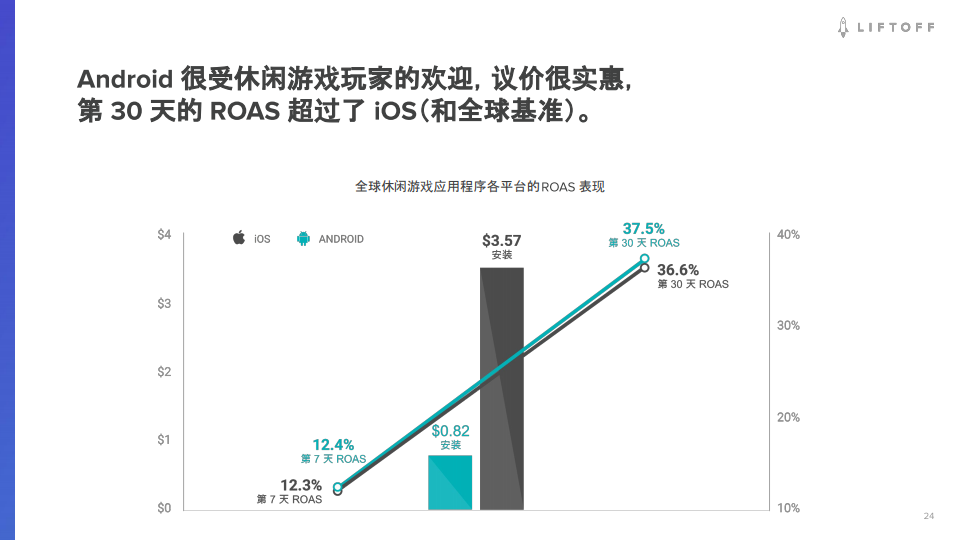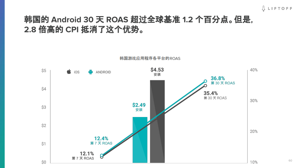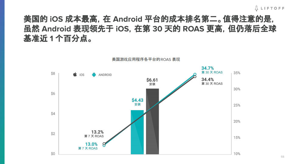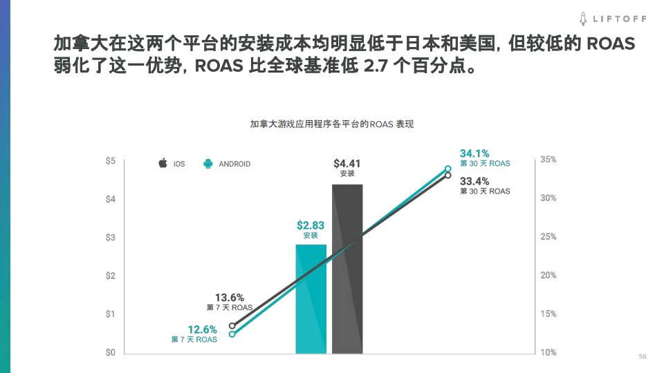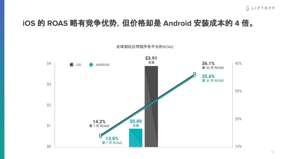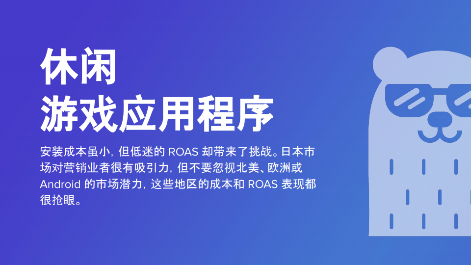 Android和iOS平台的竞争从未停止过。在今年“下载为王”的激烈竞争模式下,两个平台的表现不相伯仲。尽管两者存在很多相似之处,但Android仍处于领先,并连续2年超越iOS。Android平台的安装成本为0.89美元,仅为iOS(3.91美元)的1/4。而Android的7天ROAS也高于iOS的2.8%,再次在移动营销者面前彰显实力。此外,Android平台的CPI已连续两年低于iOS。现在,移动营销者是时候考虑如何通过Android平台提升应用内购买,并获得比iOS平台更高的ROI。