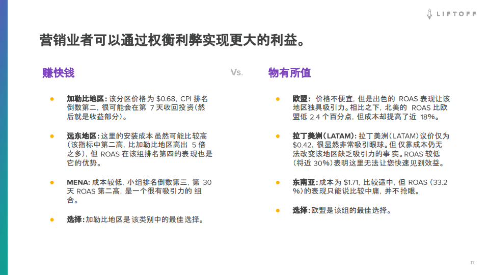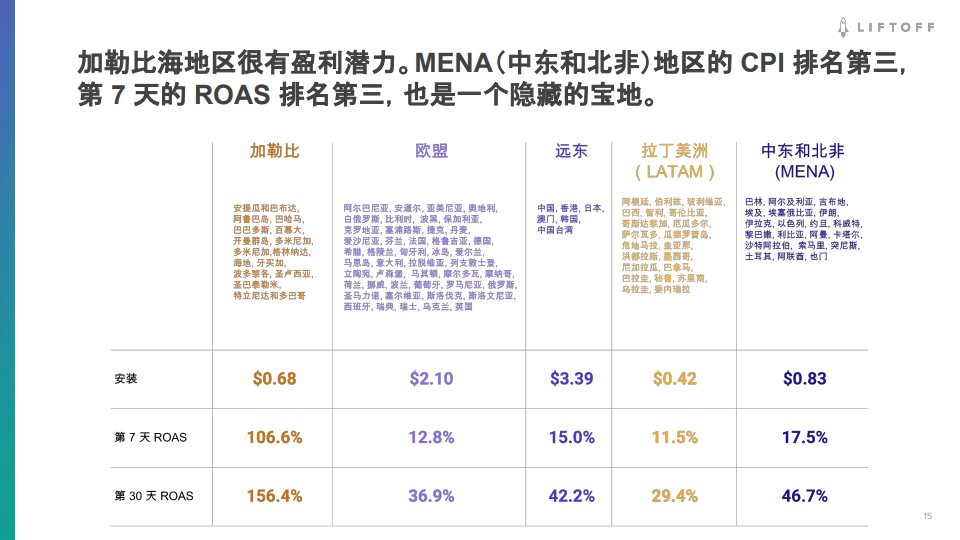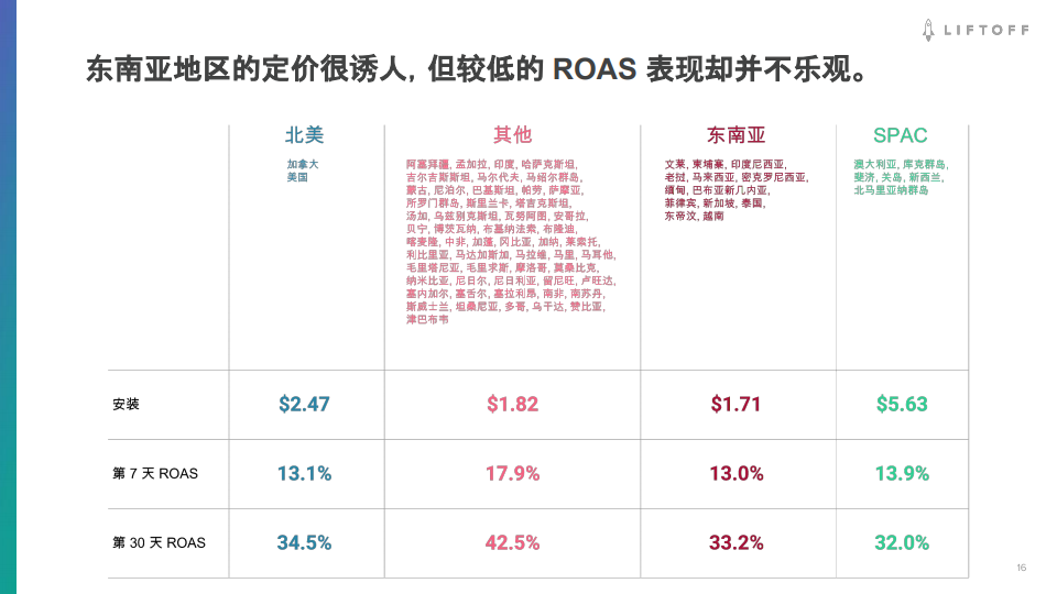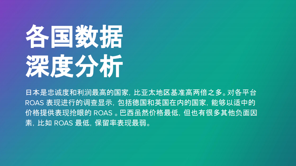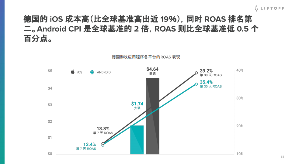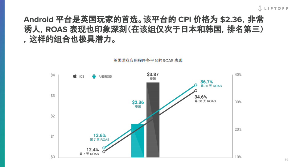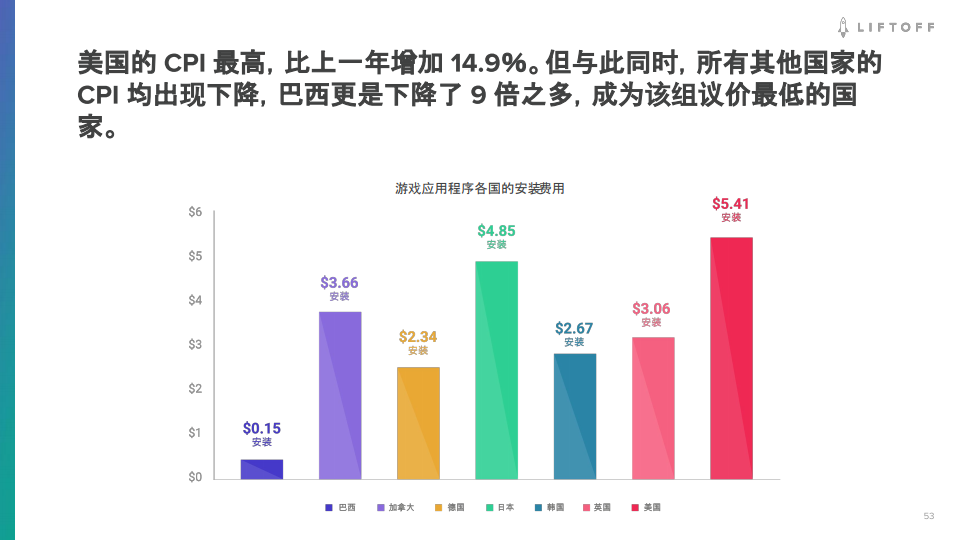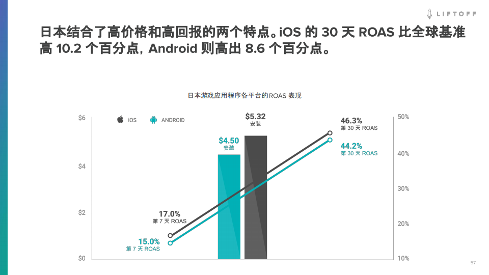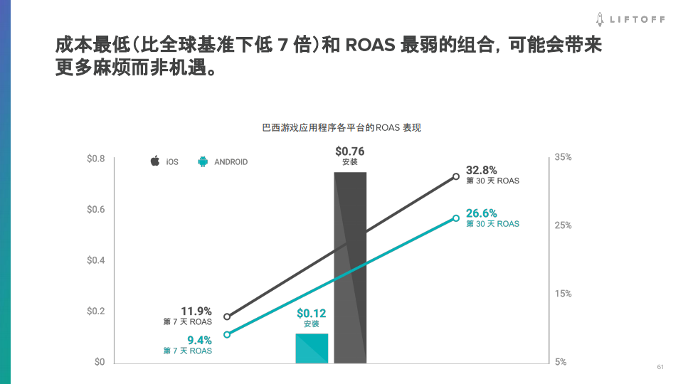 Android和iOS平台的竞争从未停止过。在今年“下载为王”的激烈竞争模式下,两个平台的表现不相伯仲。尽管两者存在很多相似之处,但Android仍处于领先,并连续2年超越iOS。Android平台的安装成本为0.89美元,仅为iOS(3.91美元)的1/4。而Android的7天ROAS也高于iOS的2.8%,再次在移动营销者面前彰显实力。此外,Android平台的CPI已连续两年低于iOS。现在,移动营销者是时候考虑如何通过Android平台提升应用内购买,并获得比iOS平台更高的ROI。