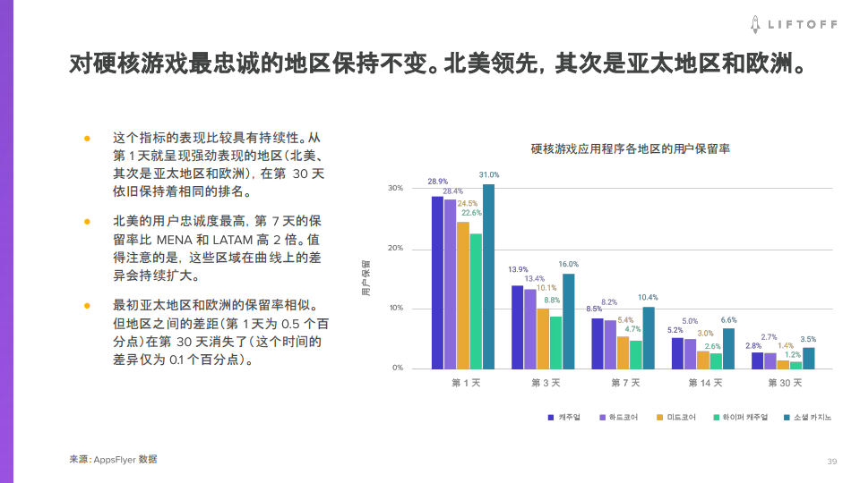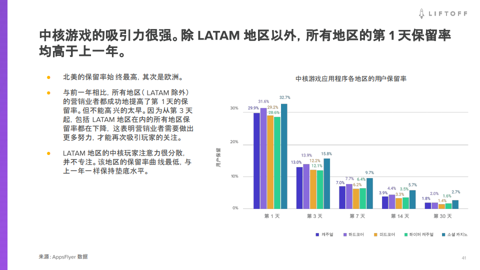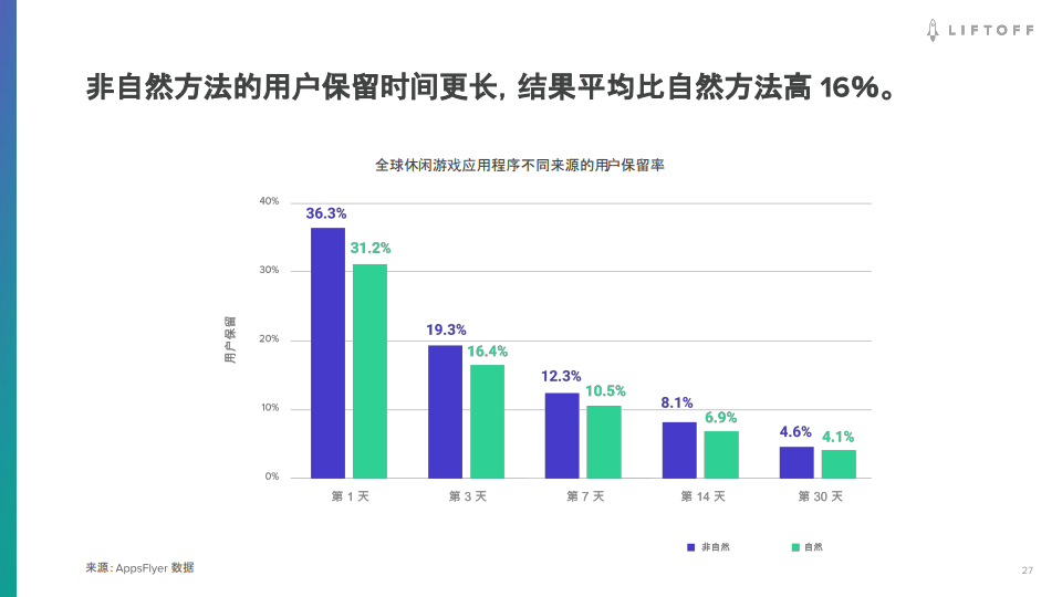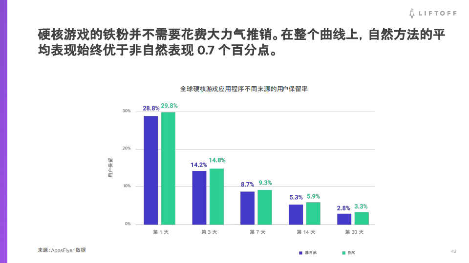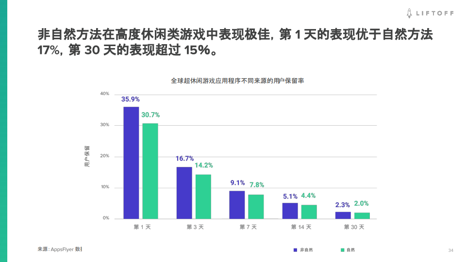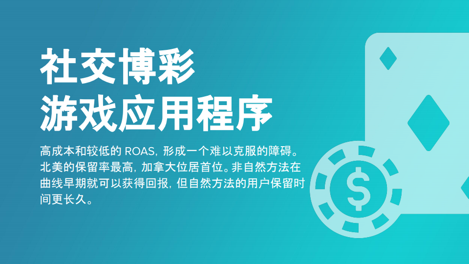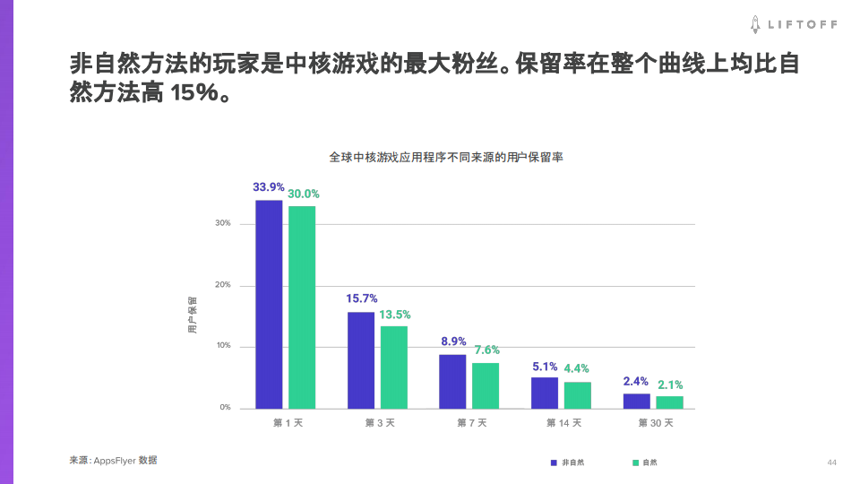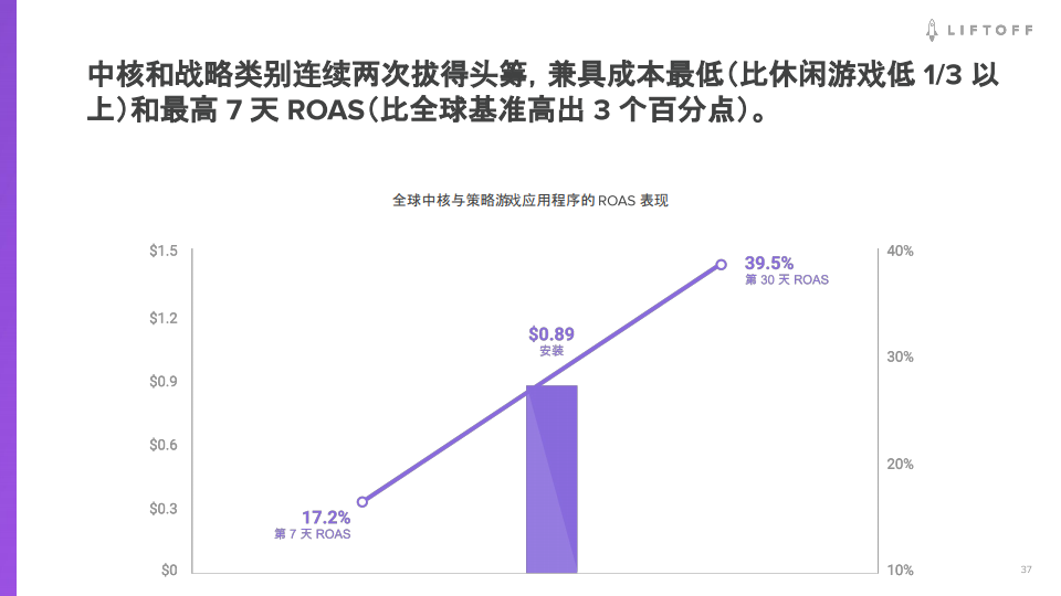 同时,策略游戏和中度游戏力拔头筹,其成本最低(比休闲游戏低1/3以上),ROAS位居各个游戏类别之首。第7天后为17.2%,第30天后为39.5%,高于全球基准3%。付费获取用户热衷于中度游戏,平均留存率为15%,远高于自然获取用户。