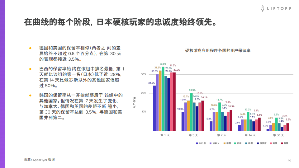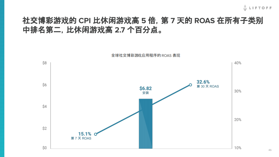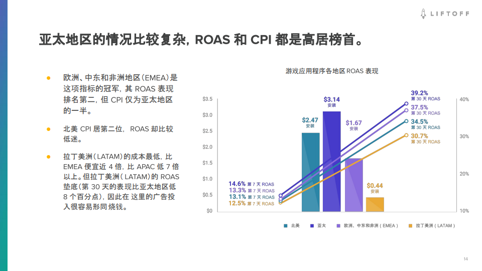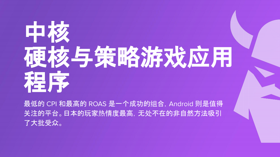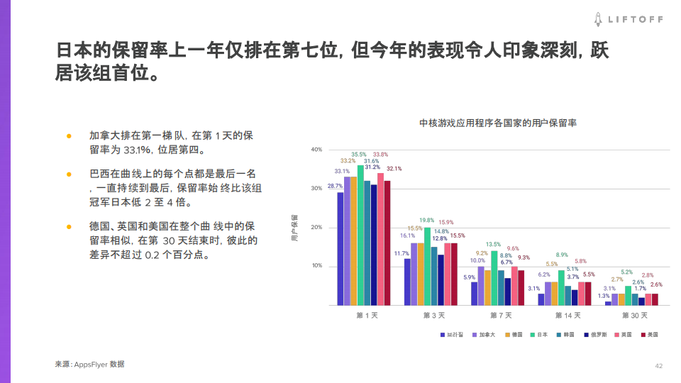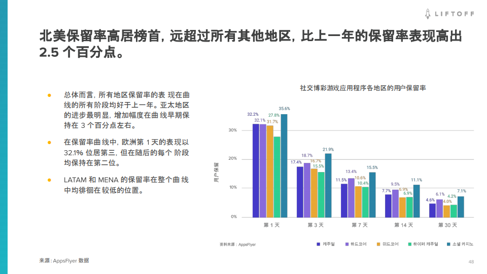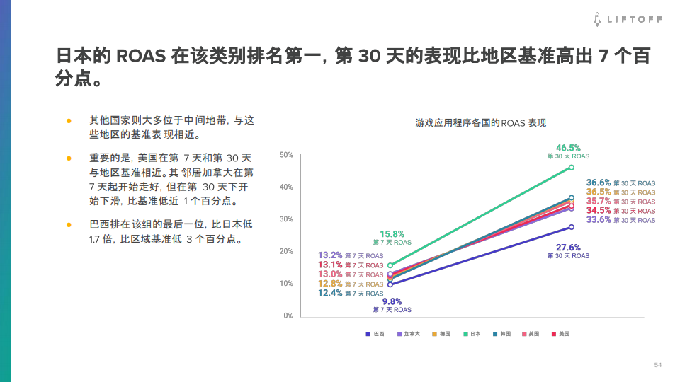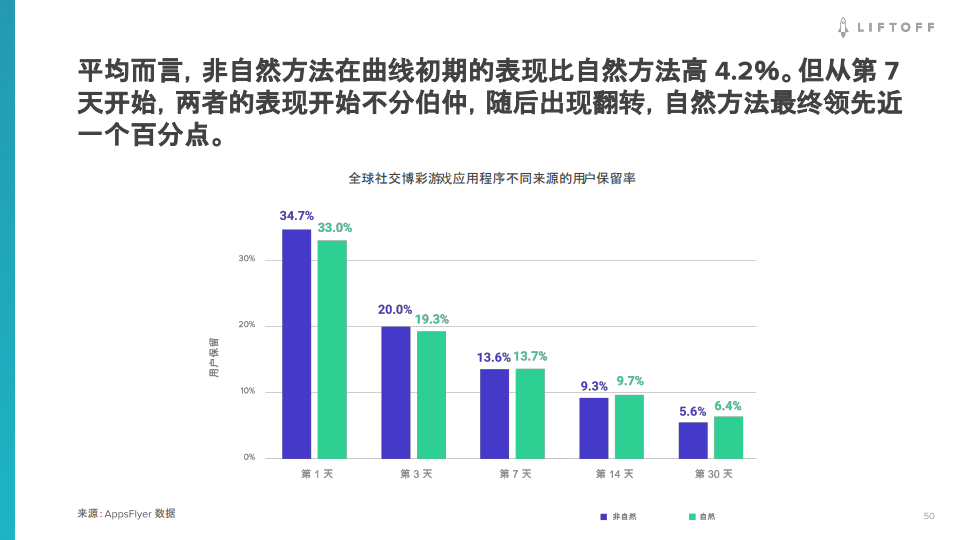 同时,策略游戏和中度游戏力拔头筹,其成本最低(比休闲游戏低1/3以上),ROAS位居各个游戏类别之首。第7天后为17.2%,第30天后为39.5%,高于全球基准3%。付费获取用户热衷于中度游戏,平均留存率为15%,远高于自然获取用户。