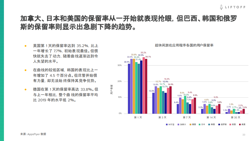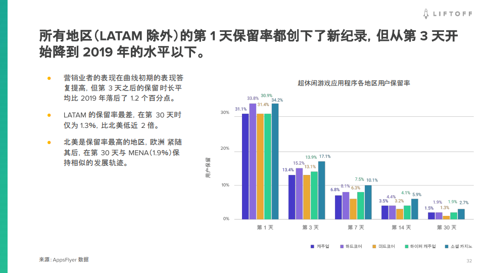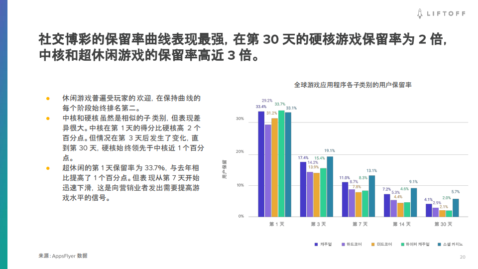 随着消费者逐渐适应新冠疫情的新常态,Liftoff数据揭示了新的趋势。玩家有意愿在移动游戏上投入更多的时间和精力,这对于中度游戏和策略游戏来说可谓利好。休闲游戏和超休闲游戏的留存率同比略有下降,第3日留存比2019年平均水平下降1.2%。