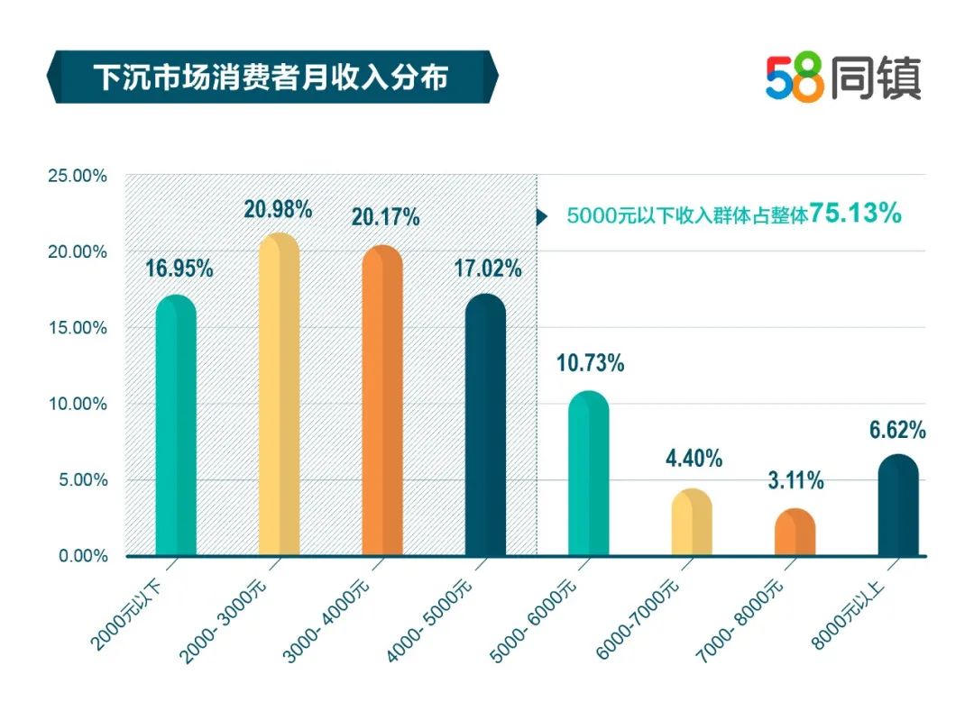 据58同镇《2020年中国下沉市场快消品洞察报告》显示,2017年来,农村居民可支配收入增速对比城镇居民增长迅速,农村居民收入持续向好。不过从收入绝对值上看,月收入在5000元以下群体占整体75.13%,中低收入仍是下沉市场主体收入群体。