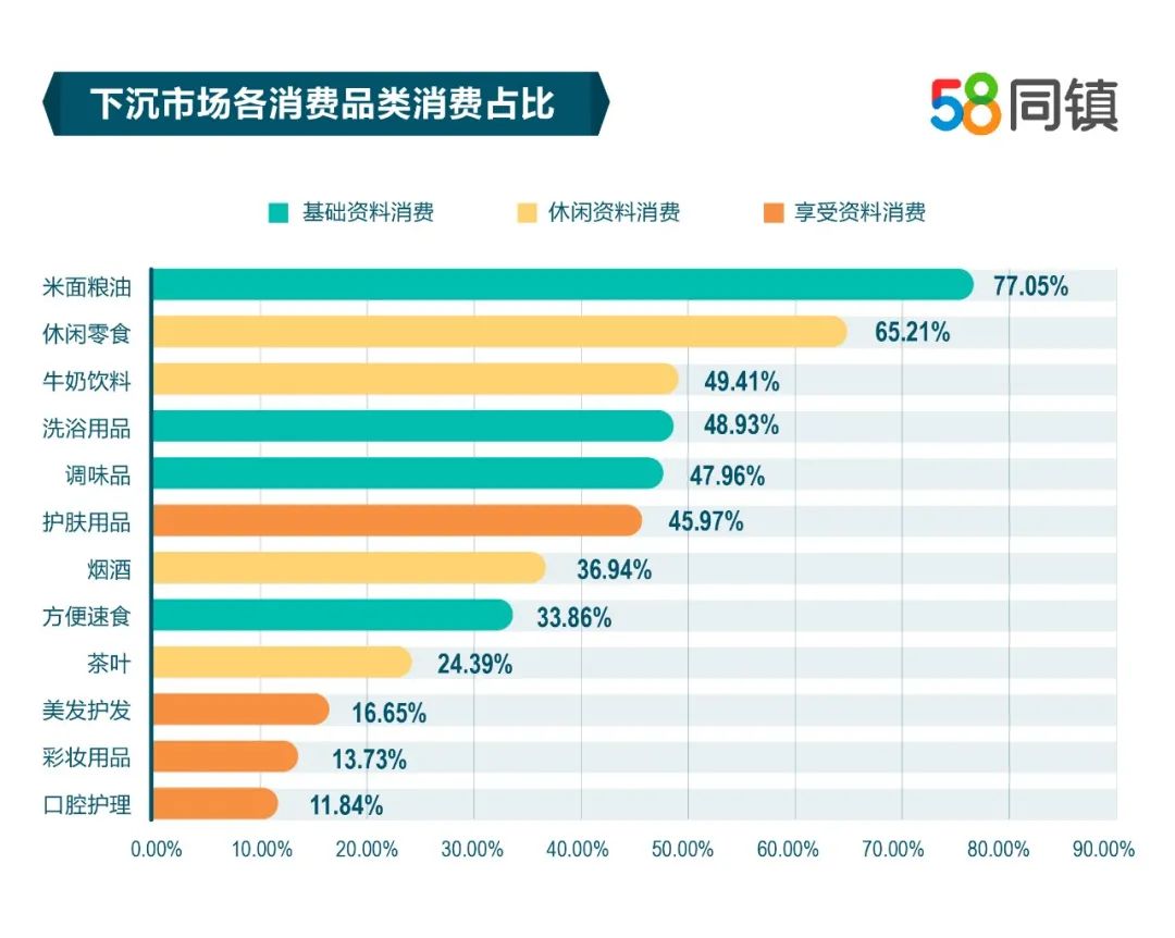 比较分析下沉市场用户的消费种类,58同镇数据表明,米面粮油类消费占比最高,达77.05%;其次是休闲零食和牛奶饮料,占比分别为65.21%和49.41%。综合来看,选择米面粮油等生活基础消费品的频次占比44.03%,远高于口腔护理、彩妆用品、美发护发类享受型消费的18.69%,可见,与基础资料类消费相比,享受型消费还有较大的挖掘潜力。