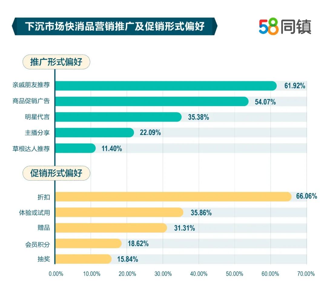 从快消品推广形式上看,61.92%的下沉市场用户愿意接受亲戚朋友推荐,其次是商品促销广告,占比54.07%。而在促销形式上,66.06%的下沉市场用户偏好折扣,其次是体验或试用、赠品,分别占比35.86%、31.31%。由于下沉市场属于“熟人社会”,人际交往密切、亲友间信任感强,因此亲友对快消品的推荐十分有效。而在促销形式上,下沉市场对价格优惠非常敏感,降价是有效的促销手段。