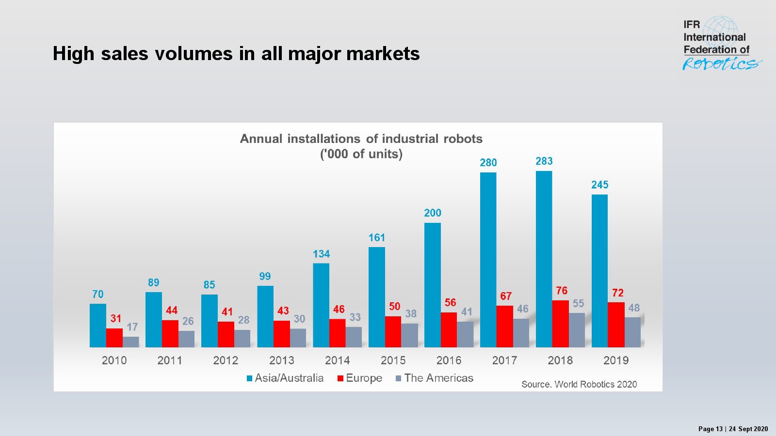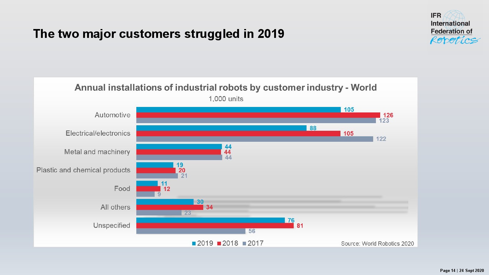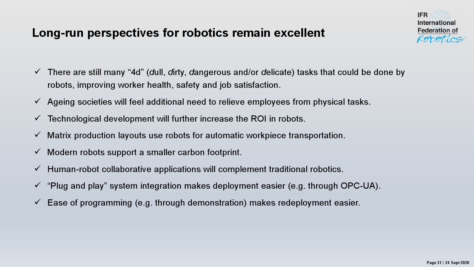 在全球范围内,新冠肺炎对2020年产生了强大的影响,但也为复苏过程中的生产现代化和数字化提供了机会。从长远来看,增加机器人安装的好处是不变的:快速生产和以具有竞争力的价格交付定制产品是主要的激励因素。