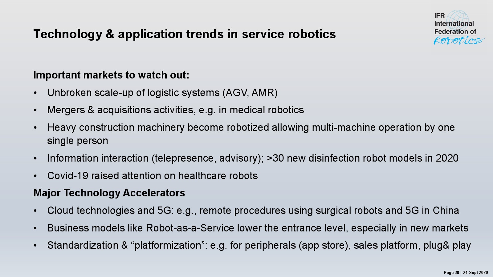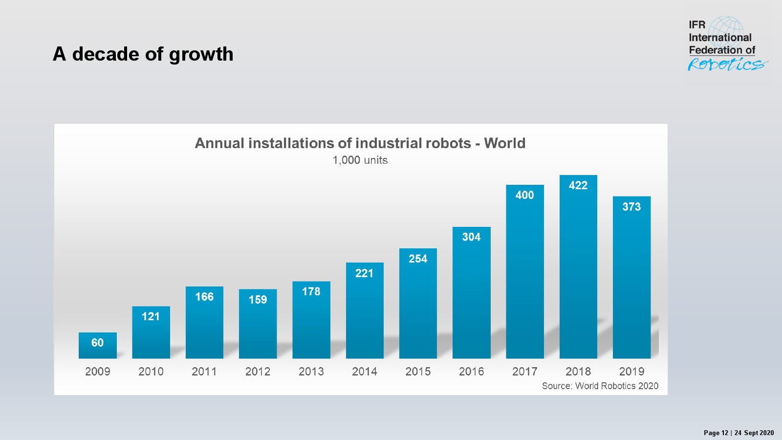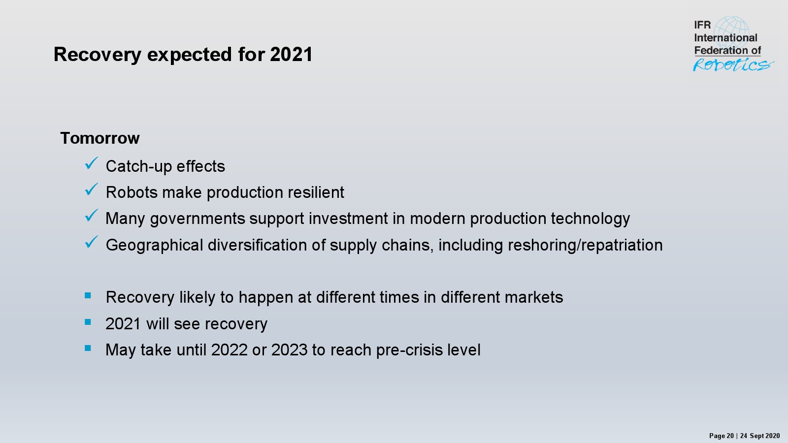 在全球范围内,新冠肺炎对2020年产生了强大的影响,但也为复苏过程中的生产现代化和数字化提供了机会。从长远来看,增加机器人安装的好处是不变的:快速生产和以具有竞争力的价格交付定制产品是主要的激励因素。
