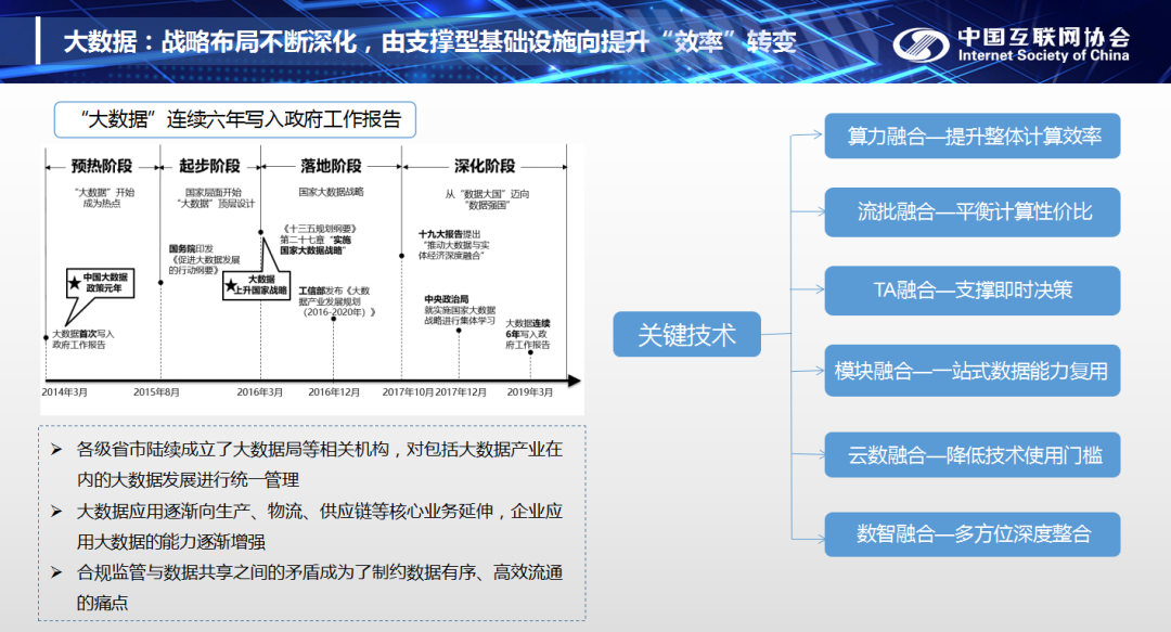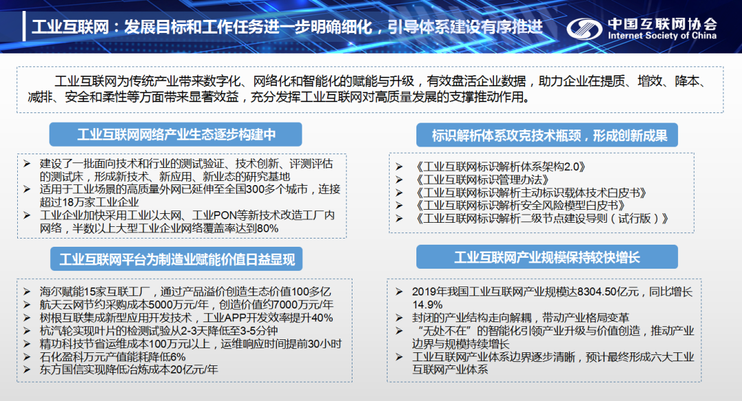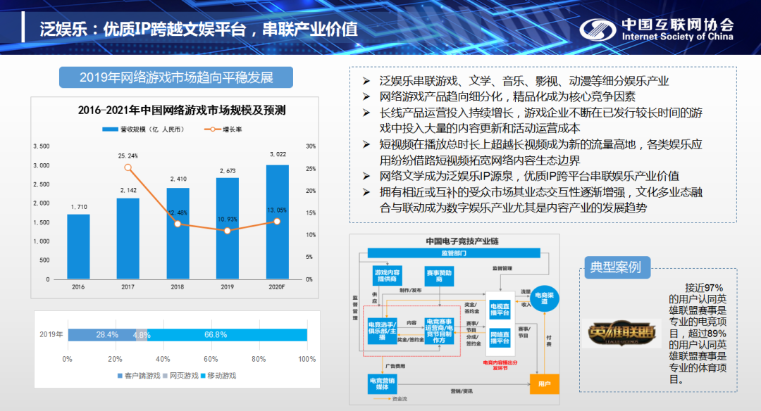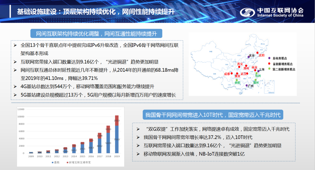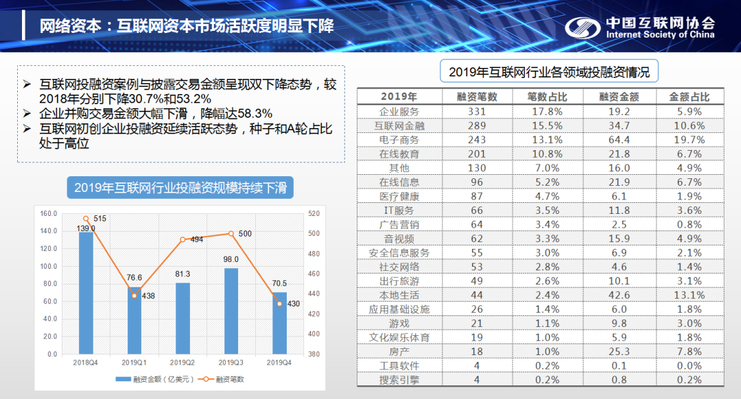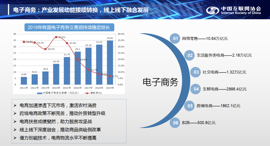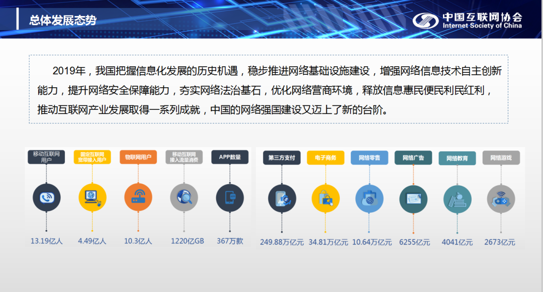 中国互联网协会:中国互联网发展报告2020 从具体数据来看,截至2019年底,我国移动互联网用户规模达13.19亿,占据全球网民总规模的32.17%;4G基站总规模达到544万个,占据全球4G基站总量的一半以上;移动互联网接入流量消费达1220亿GB,较去年同比增长71.6%;电子商务交易规模34.81万亿元,已连续多年占据全球电子商务市场首位;网络支付交易额达249.88万亿元,移动支付普及率位于世界领先水平;全国数字经济增加值规模达35.8万亿元,已稳居世界第二位。 何桂立指出,从产业发展的外部环境来看,新型战略性、网络型信息基础设施建设及云计算、大数据、人工智能、虚拟现实等新一代信息技术应用为互联网发展赋予创新活力。从互联网应用与服务层面来看,“互联网+”持续助推传统产业转型升级,各互联网细分领域市场规模稳定增长,行业环境不断优化,新产品、新业态层出不穷,服务模式不断迭代演进,市场格局洗牌革新。 何桂立表示,《中国互联网发展报告》是由中国互联网协会组织编撰的大型编年体研究报告,通过凝聚业界专家智慧,忠实地记录和描绘互联网行业发展轨迹,打造具有专业性和权威性的互联网研究资源池,竭诚为政府的决策和产业的发展服务。下一步,中国互联网协会将陆续发布互联网细分领域报告,期望为互联网管理部门、从业企业及业界专家提供专业的参考和借鉴,希望大家持续关注。 更多阅读:2014年中国音乐产业发展报告–(节选)2014年浙江省互联网发展报告中国互联网协会:2018中国互联网发展报告网宿科技:2012年Q2中国互联网发展报告网宿科技:2015年Q3中国互联网发展报告eMarketer:预计2018年中国成年人每天将花3小时上网CNNIC:2015年第37次中国互联网络发展状况统计报告–企业互联网基础应用(四)WeAreSocial:2015年8月中国互联网、社交、移动和电子商务最新数据reMED:2015中国互联网医疗发展报告网宿科技:2013年Q3中国互联网发展报告CCAGM&冯氏集团:2019-2020年中国百货零售业发展报告商务部:中国数字服务贸易发展报告 2018中国百货商业协会:2018-2019年度中国百货零售业发展报告商务部:2017-2018年中国零售行业发展报告商务部:2017年中国电视购物行业发展报告