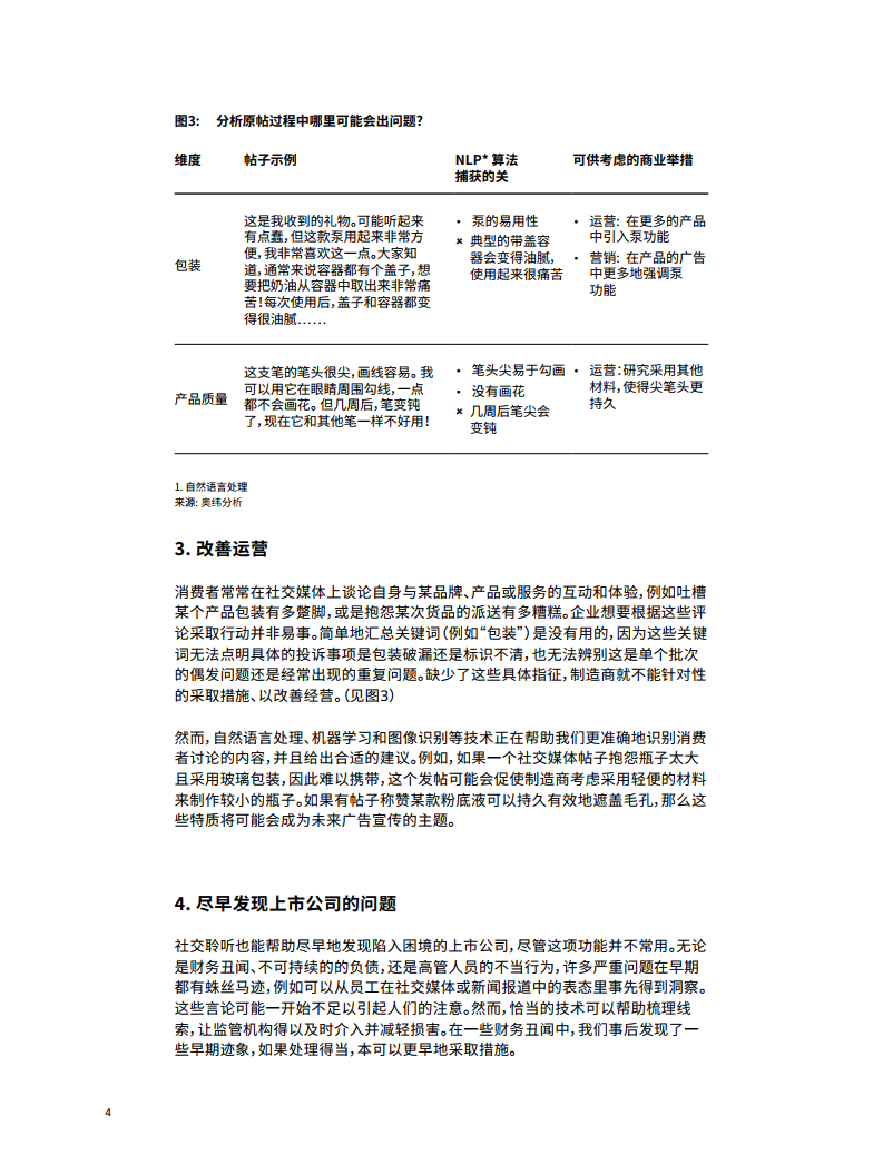 消费者常常在社交媒体上谈论他们与某品牌、产品或服务的互动和体验,例如吐槽某个产品包装有多蹩脚,或是抱怨某次货品的派送有多糟糕。企业想要根据这些评论采取行动并非易事。简单地汇总关键词(例如“包装”)是没有用的,因为这些关键词无法点明具体的投诉事项是包装破漏还是标识不清,也无法辨别这是单个批次的偶发问题还是经常出现的重复问题。缺少了这些具体指征,制造商就不能针对性的采取措施、改善经营。(见图3)