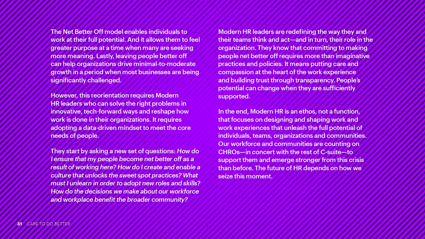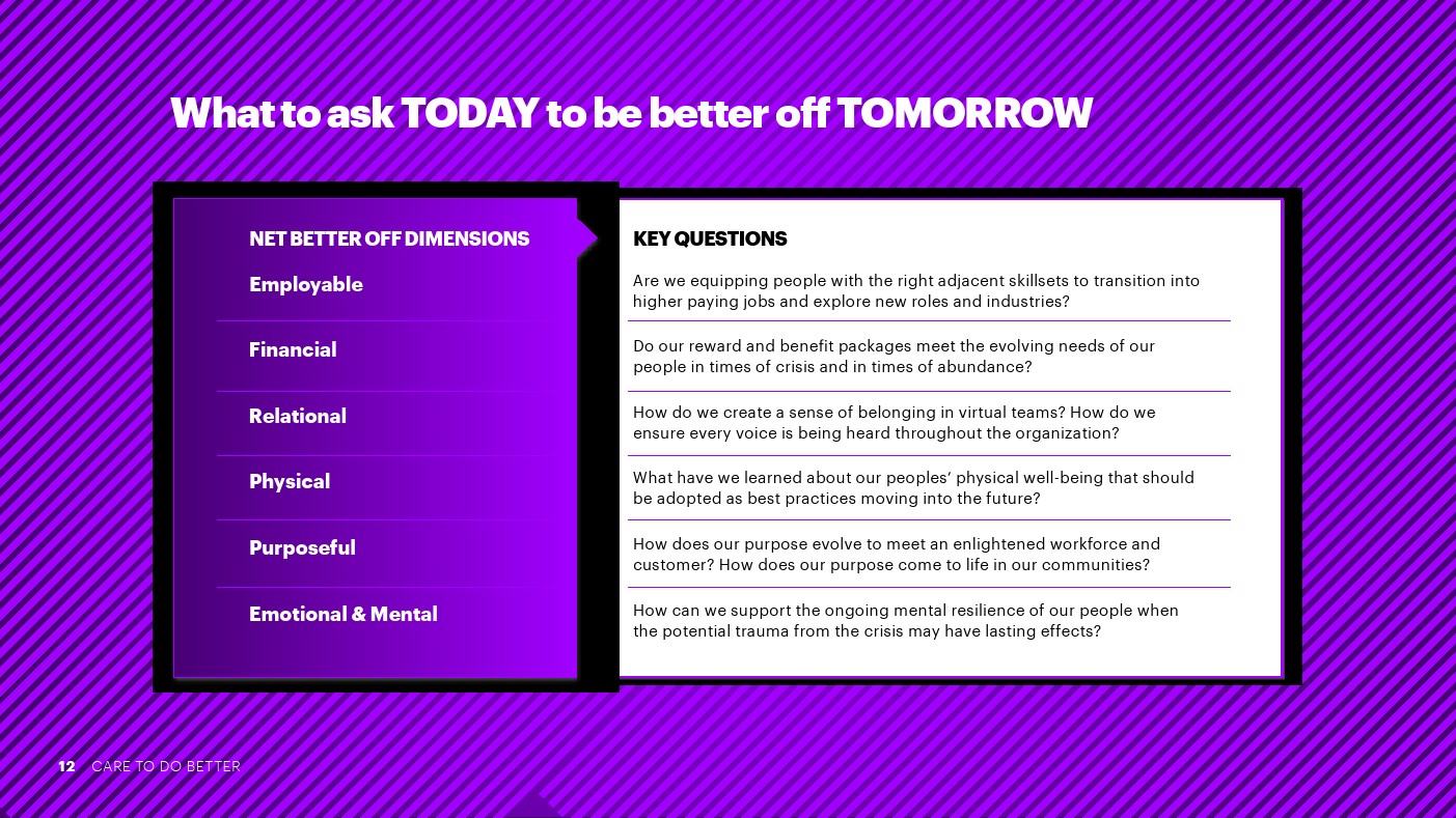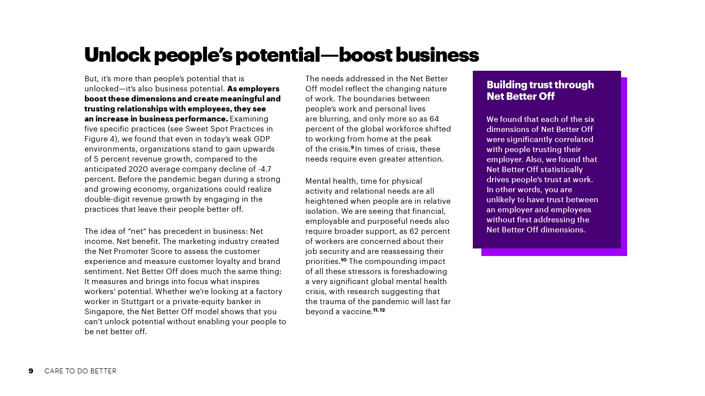 这项研究引入了一个名为“Net Better Off”的框架,该框架围绕六个不同且相互关联的维度展开,领导者必须关注这六个维度,以释放员工的潜力: