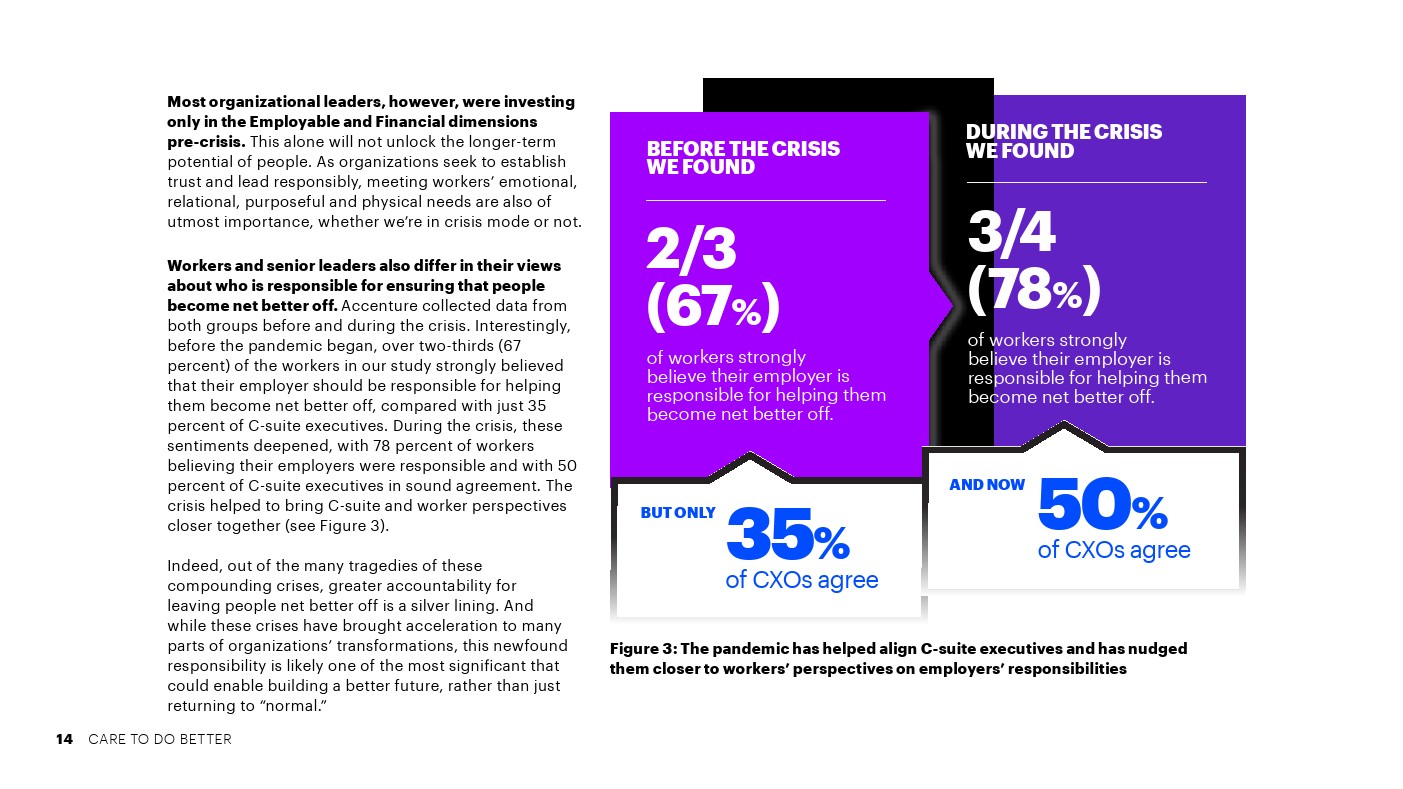 这项研究发现,关于让人们在工作中变得更富裕的责任在哪里,在大流行之前存在着显著的差距,员工比首席执行官(67%对35%)更有可能认为责任在雇主身上。