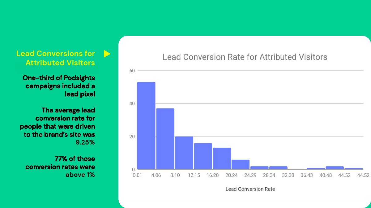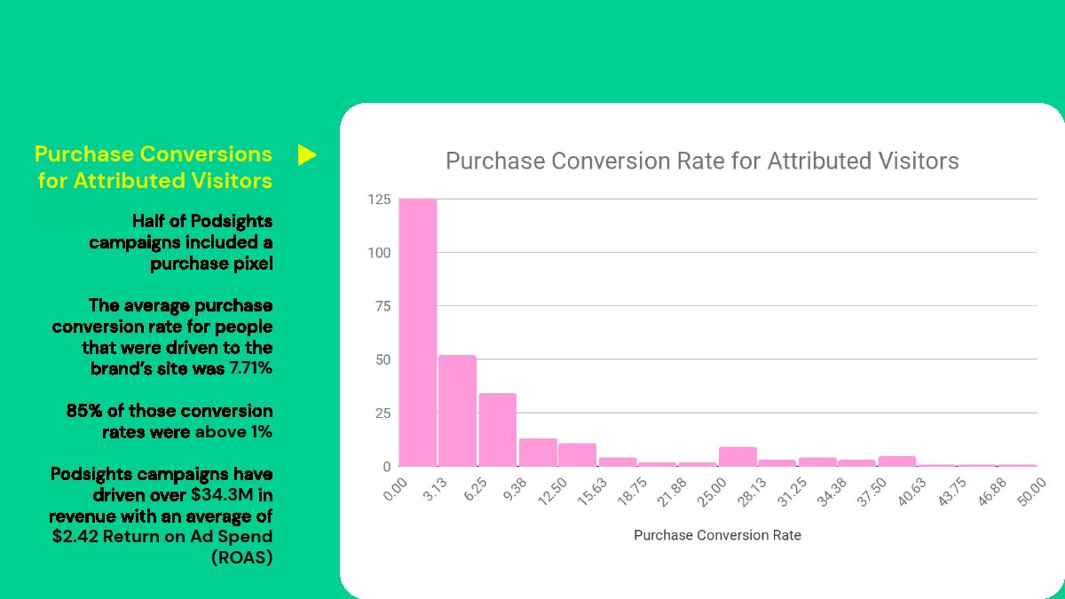从播客广告向其他网站的曝光角度来看,一半的广告活动都使用购买指标来跟踪用户。分析显示,进入品牌网站的用户的平均转化率为7.71%,而跨行业购买的平均转化率达到3.12%。