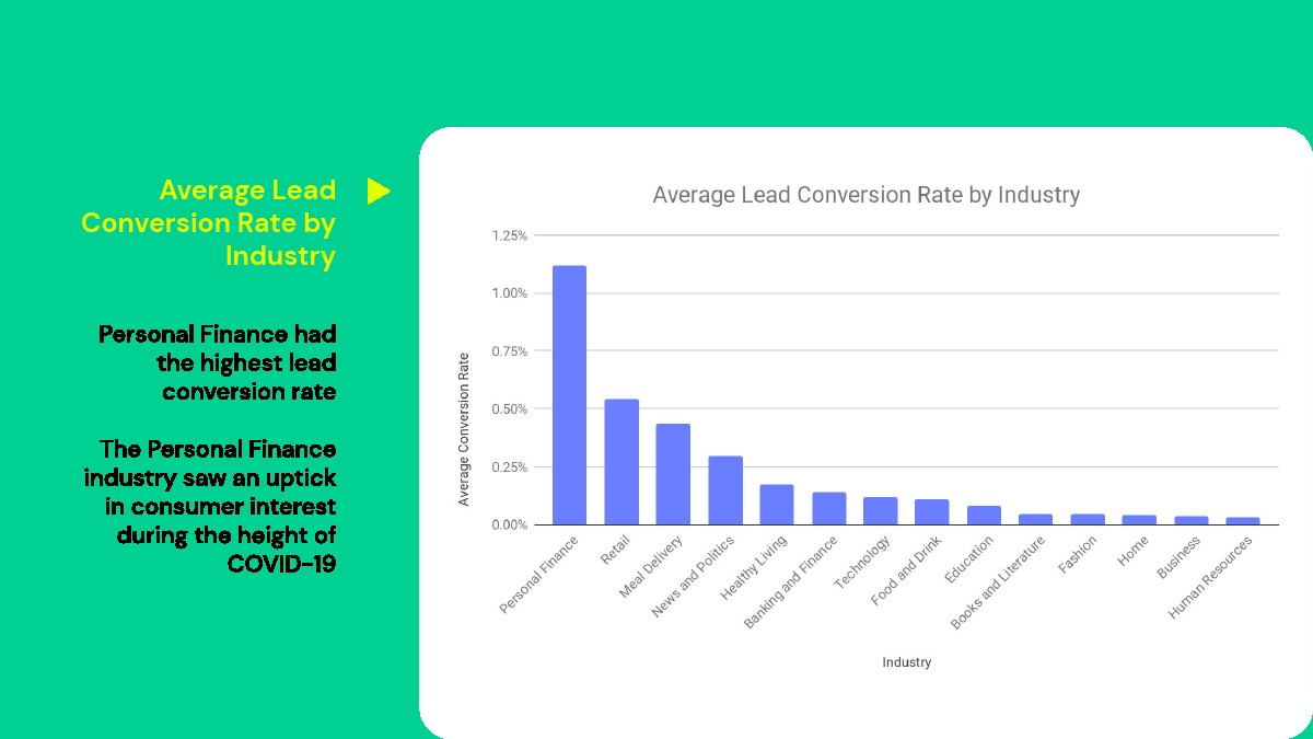 报告发现,归因访问者的平均潜在客户转化率为9.25%。个人理财行业在这个指标上领先,其次事零售和外卖。
