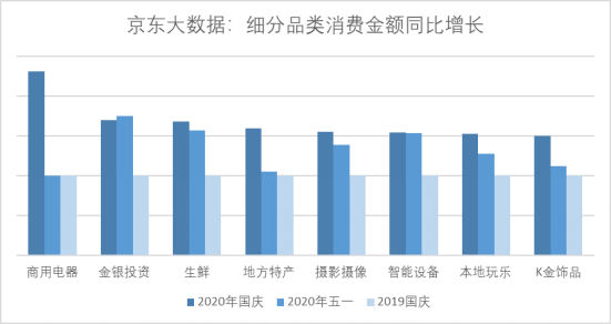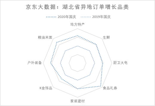 此外,受疫情影响较为严重的地区,在今年双节假期中,消费的复苏力度十分可观。以湖北省为例,节日期间整体消费金额超过去年十一30%以上,消费结构也已恢复到疫前水平。其中地方特产的异地订单增长60%以上,说明越来越多的人或返乡探亲、顺带一些当地特产,或出省游玩、给远方的亲友带上一点湖北的特色产品。由于中秋因素,食品礼券的销量也大幅增长,在京东上购买既方便又高档有面儿的月饼礼券、大闸蟹礼券都成为走亲访友送礼的道选。