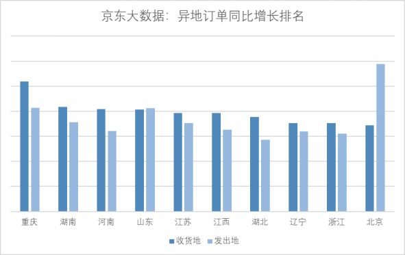 同时,长假前4天,京东全站用户向3-6线城市发出异地订单数为去年同期的130%,北京、广东、河北、江苏、山东、河南等省是向低线城市发出异地订单最多的省份,也从一个侧面说明了这些省市都是游子外出工作比较倾向的目的地。