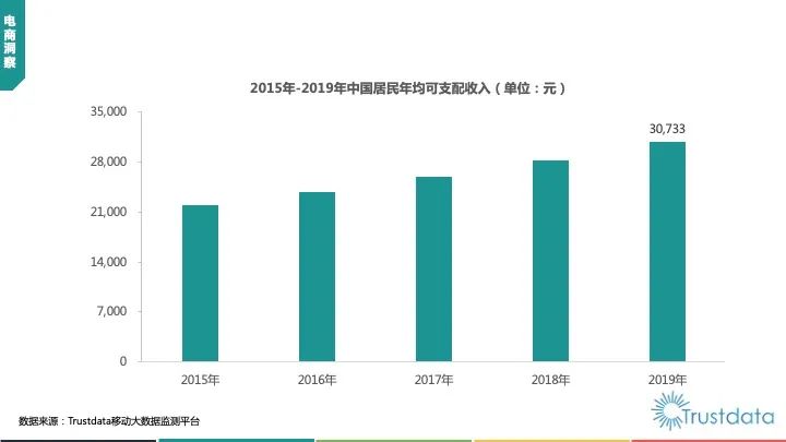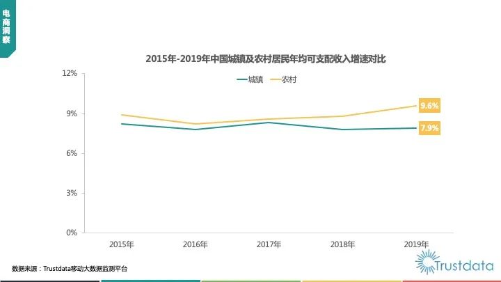据Trustdata统计数据,2020年下沉市场人口总量超10亿,城镇及农村人口占比各半,农村经济发展水平及居民消费水平低于城镇,但随着中国城镇化的加速推进,小康社会的全面建成,居民可支配收入呈现快速增长态势。据国家统计局数据,2019年中国居民人均可支配收入突破3万元,其中城镇居民39244元,同比增长7.9%,农村居民16021元,同比增长9.6%,农村增速快于城镇。总体来看,在城乡发展逐渐均衡的大前提下,拥10亿人口之巨的下沉市场,有十足的开拓潜力,有较大的结构性优化空间,必将成为双循环之内循环的强劲引擎。