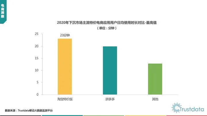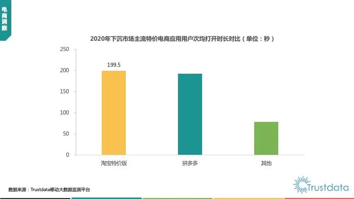 与此同时,下沉市场电商消费产品类型逐渐多元。根据Trustdata数据,实用型的生活用品依然为下沉市场的主力购买产品,但享受型产品也大幅增长,包括美容护肤,清洁护理、品牌服装,智能电子产品、玩具零食、家居装饰等;低价不再是下沉市场用户购买的第一诱因,产品质量和体验也已成为较多用户考量的因素;被动体验型消费有减少趋势,精心挑选的电商购物行为明显增加,用户不再仅依赖某一个电商应用,越来越多的用户开始跨平台对比购物。