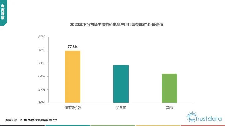 从用户端来看,经过多年发展的下沉市场,伴随着消费能力的提升,低价但低质的产品已不能满足用户日益成长的诉求,此时,用户势必转向购买更高性价比的产品,淘宝特价版借势大力让惠用户,自6月起,上线“1元包邮”活动,深受下沉市场用户喜爱,成为淘宝特价版打开下沉市场的杀手锏。促销及让惠活动拉动用户增长的同时,更直接助益用户粘性及留存的增长,据Trustdata数据,淘宝特价版上线后,用户日均启动次数最高达5.5次,次均使用时长199秒,日均使用时长最高达23分钟,月均留存最高达77.8%,均好于其他下沉电商应用。