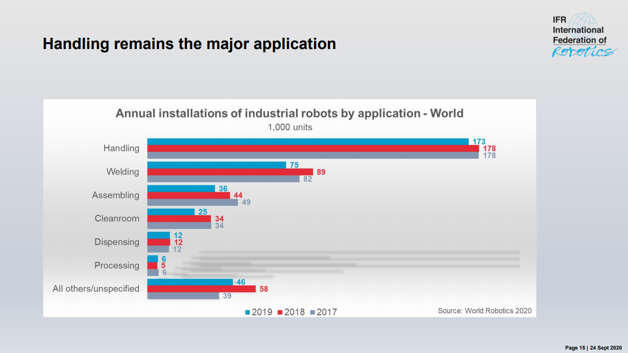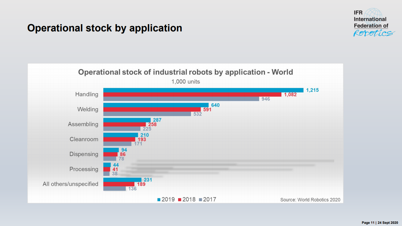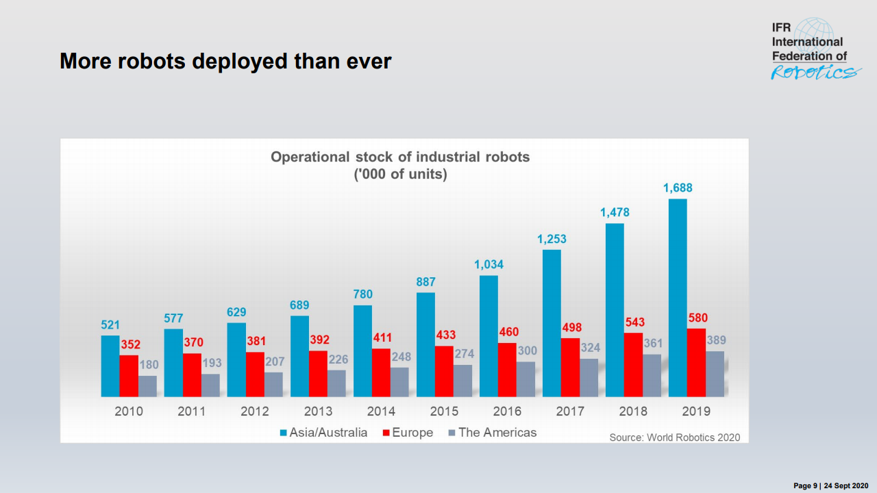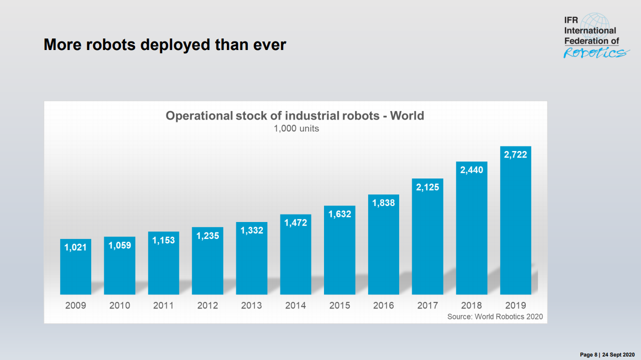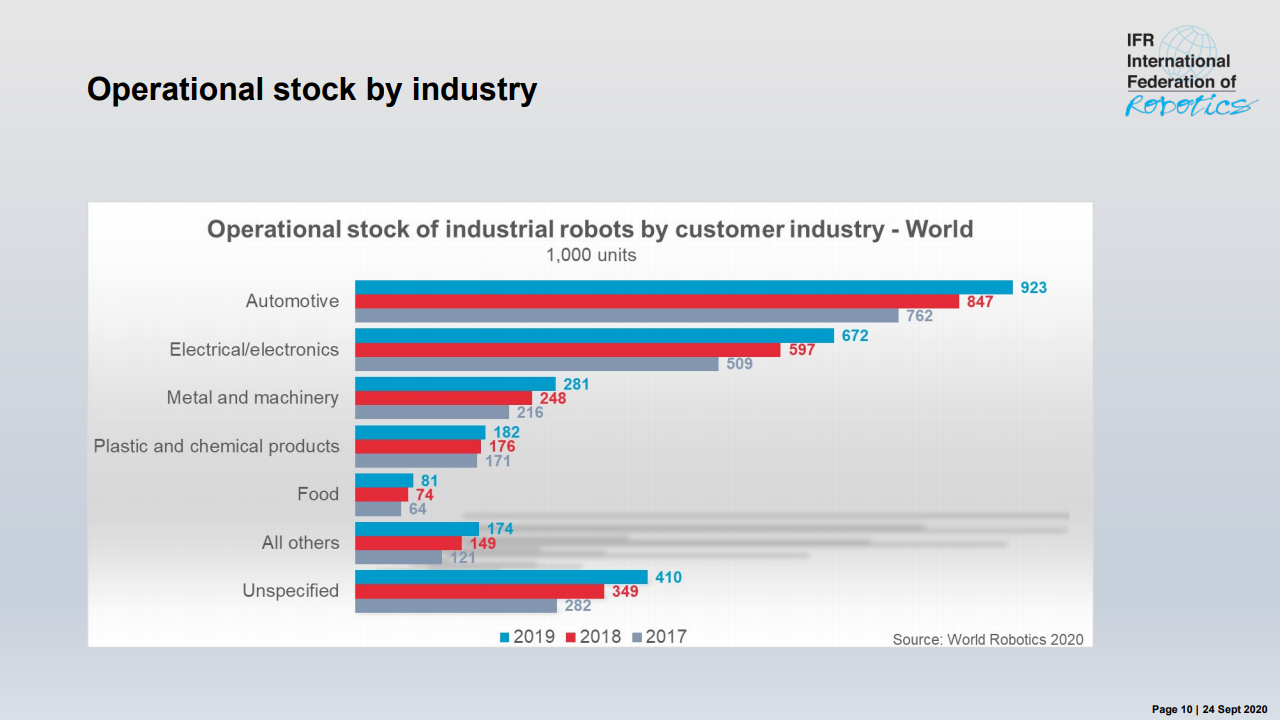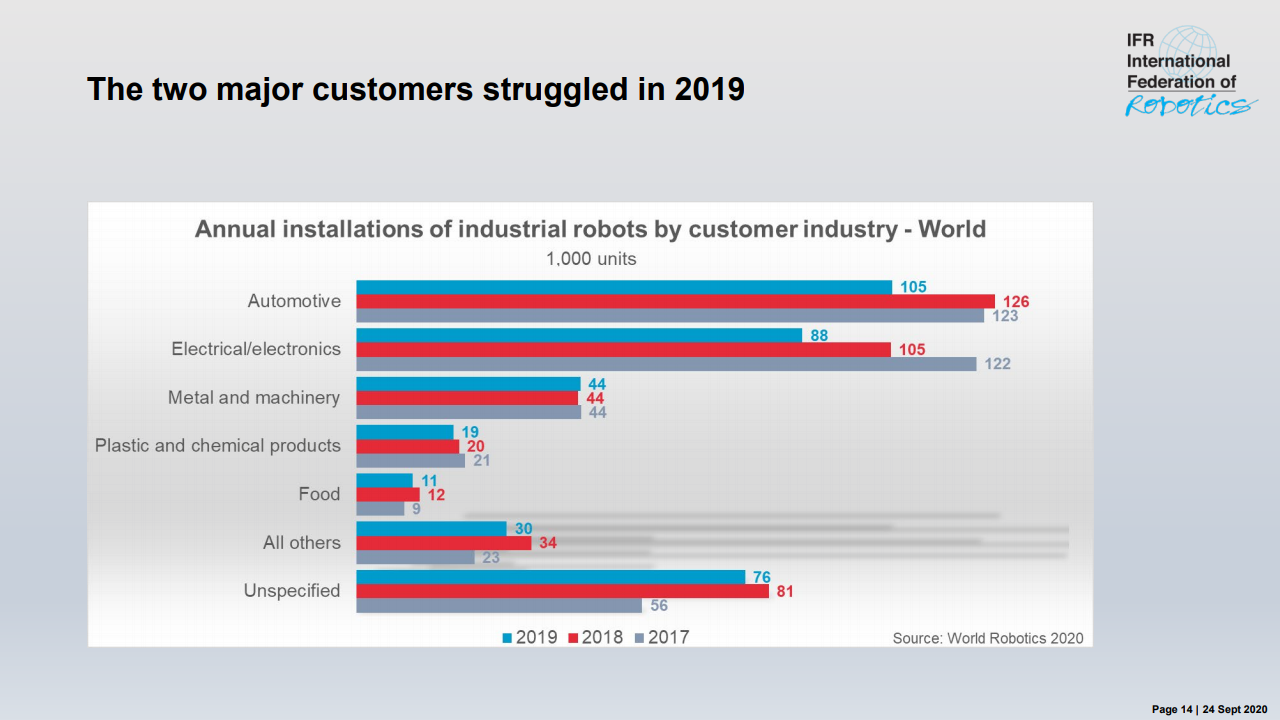 国际机器人联合会主席米尔顿·古里说:“如今,在智能生产和自动化的成功故事的推动下,在世界各地的工厂中运行的工业机器人的库存是历史最高水平。”,在五年内(2014-2019年)在全球范围内增长了约85%。最近的销售下降了12%,反映了汽车和电气/电子这两个主要客户行业经历的艰难时期。”