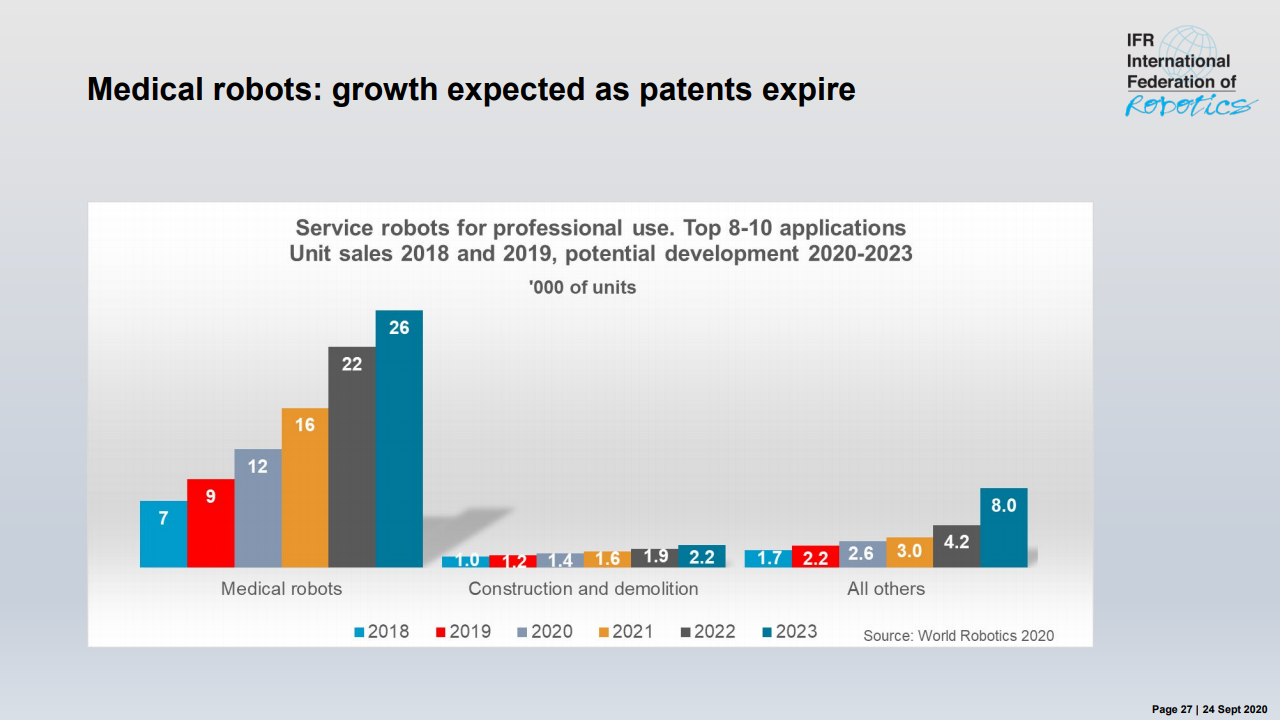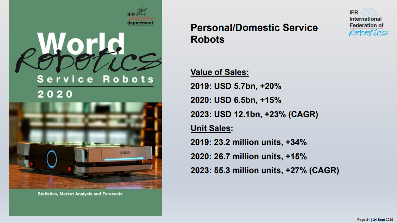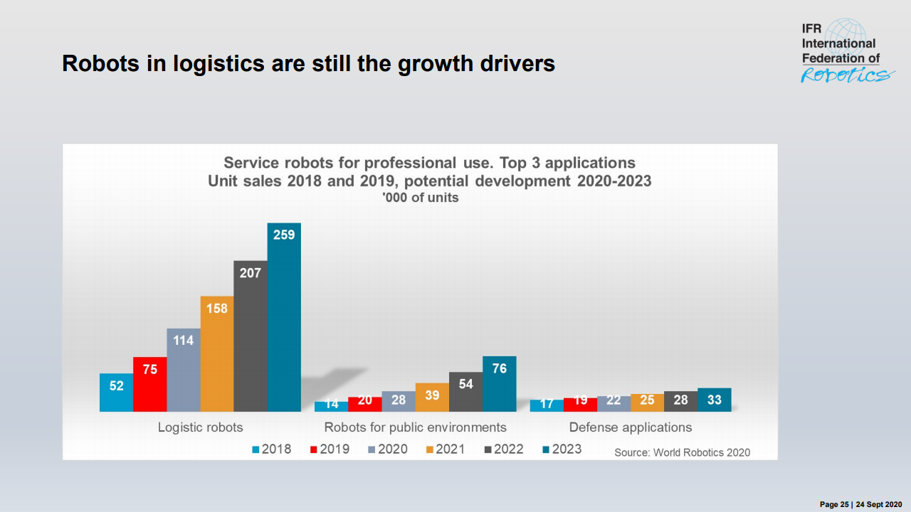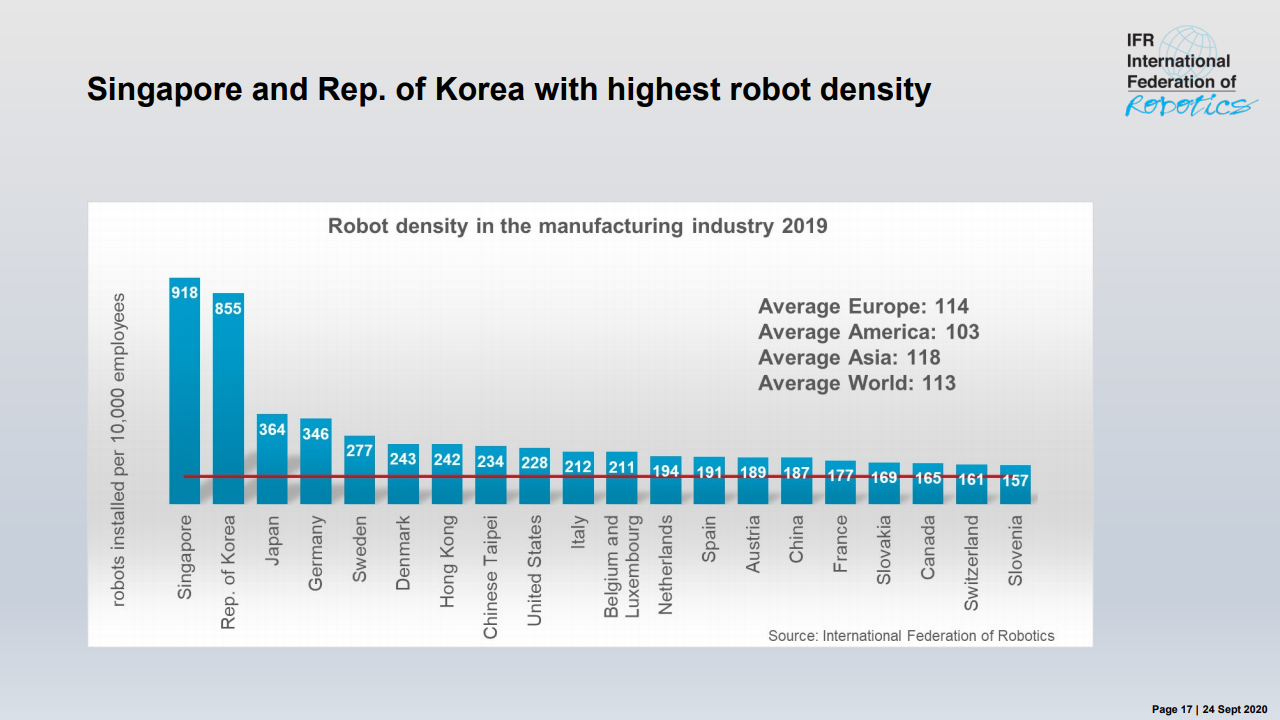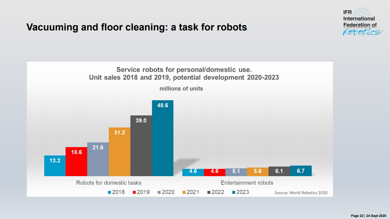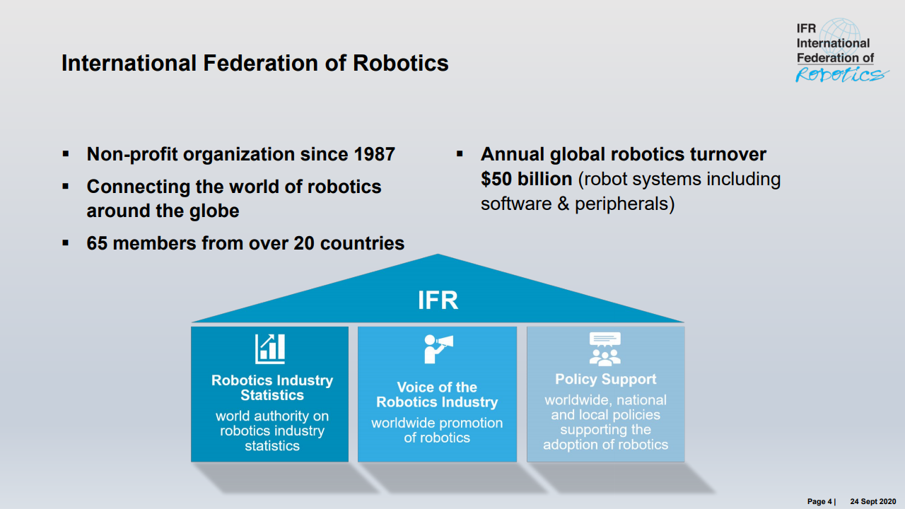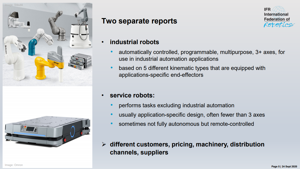 国际机器人联合会主席米尔顿·古里说:“如今,在智能生产和自动化的成功故事的推动下,在世界各地的工厂中运行的工业机器人的库存是历史最高水平。”,在五年内(2014-2019年)在全球范围内增长了约85%。最近的销售下降了12%,反映了汽车和电气/电子这两个主要客户行业经历的艰难时期。”