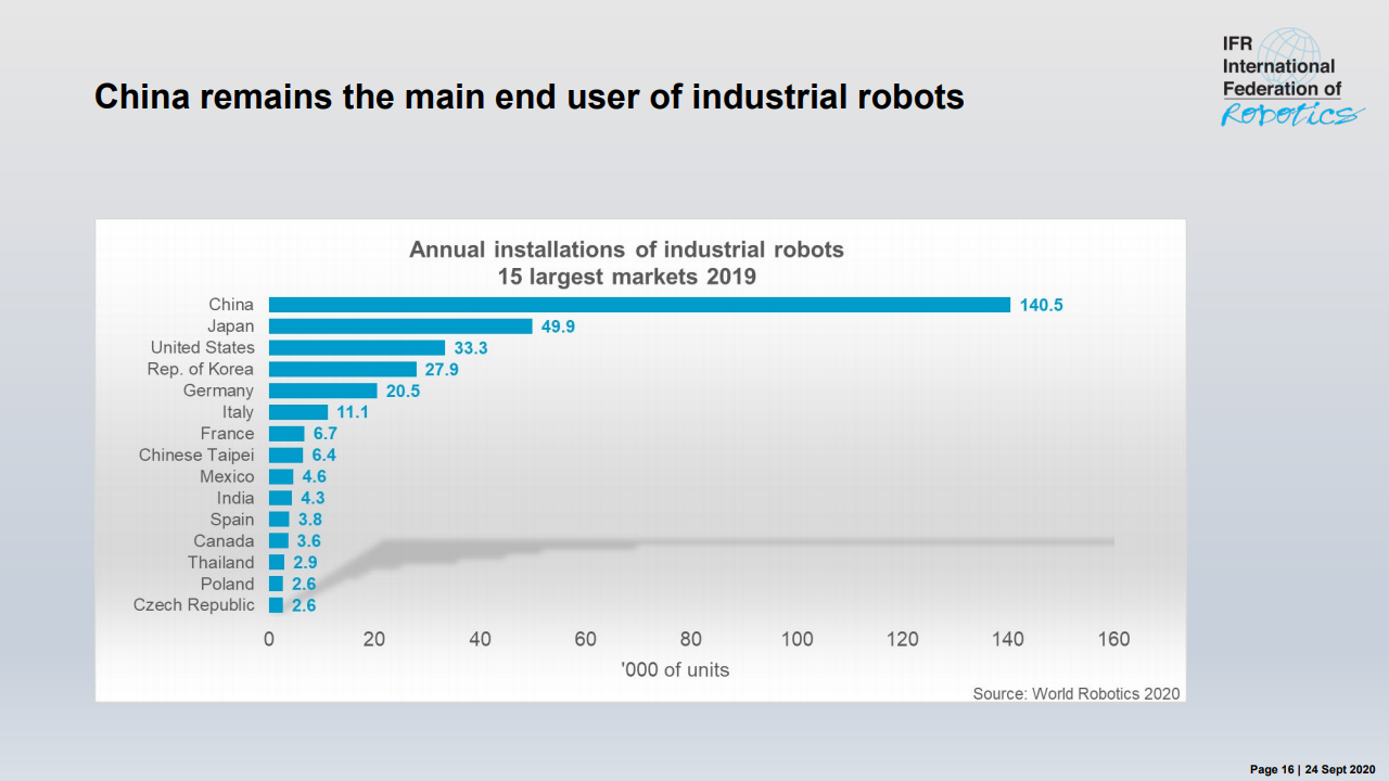 国际机器人联合会主席 Milton Guerry 说:“中国是目前世界上最大,增长最快的机器人市场。“这里每年安装的机器人数量最多,且拥有最多的可操作机器人。这种快速发展在机器人史上是独一无二的。