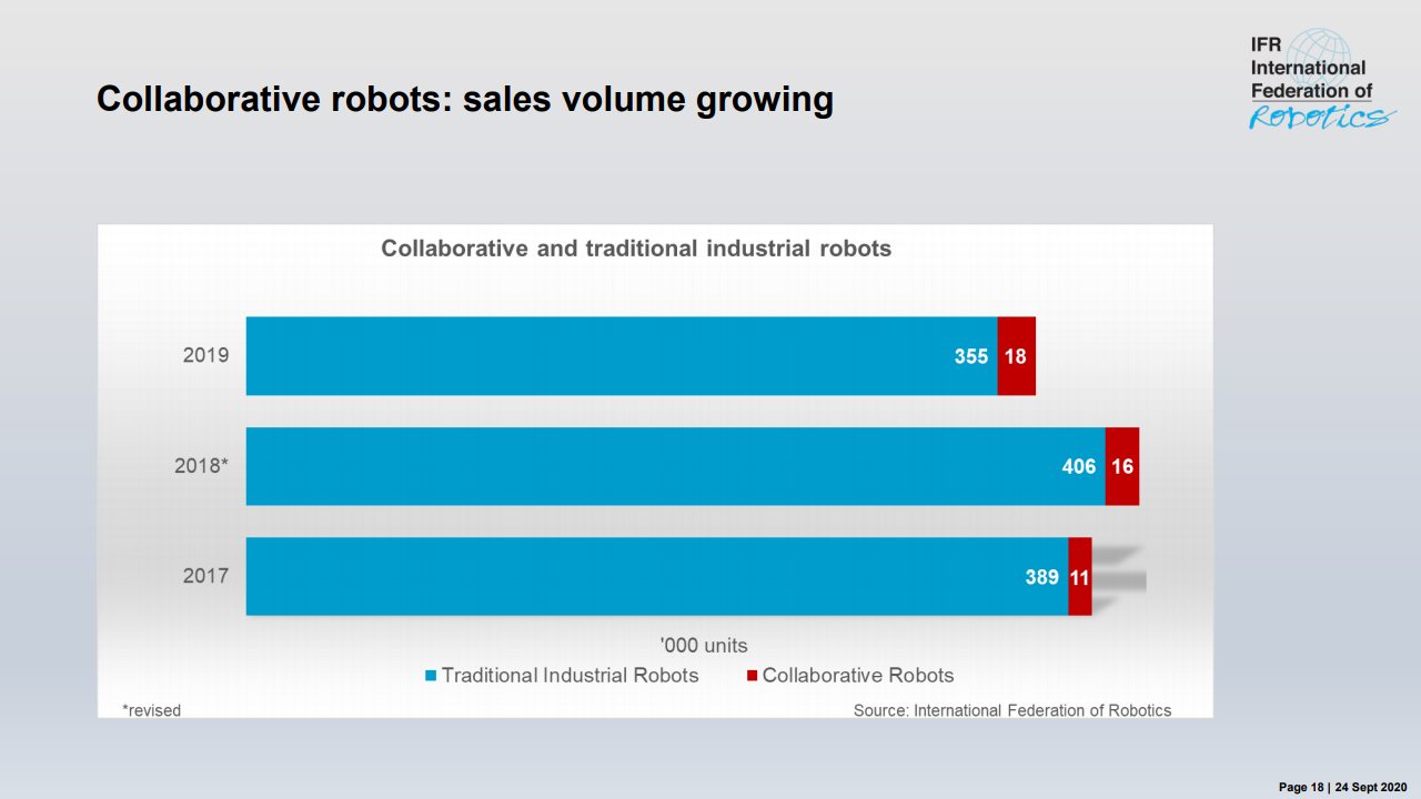 人机协作的采用正在上升。我们看到协作机器人的安装量增长了11%。这种动态的销售业绩与2019年传统工业机器人的总体趋势形成了鲜明对比。随着越来越多的供应商提供协作机器人,并且应用范围变得越来越大,2019年安装的37.3万台工业机器人的市场份额达到4.8%尽管这个市场发展迅速,但仍处于起步阶段。