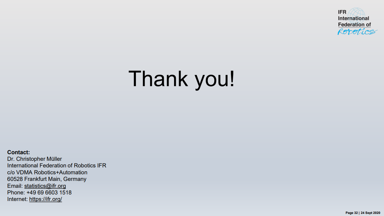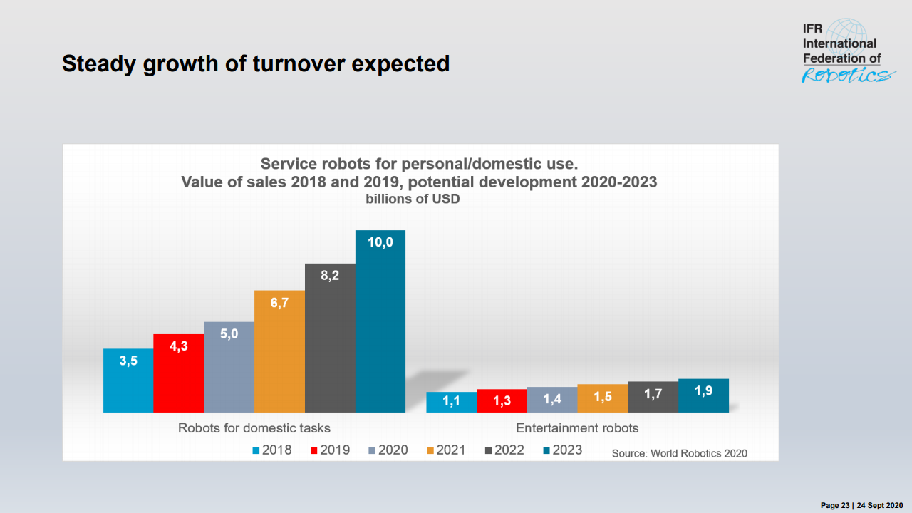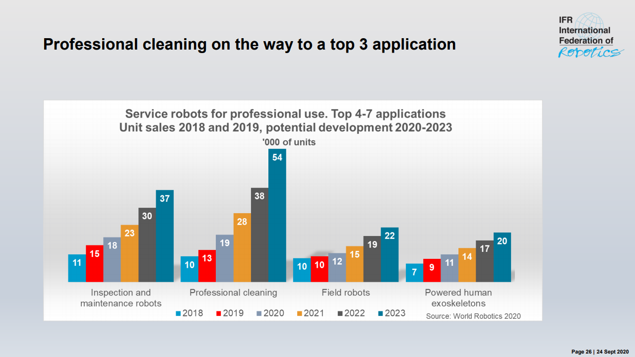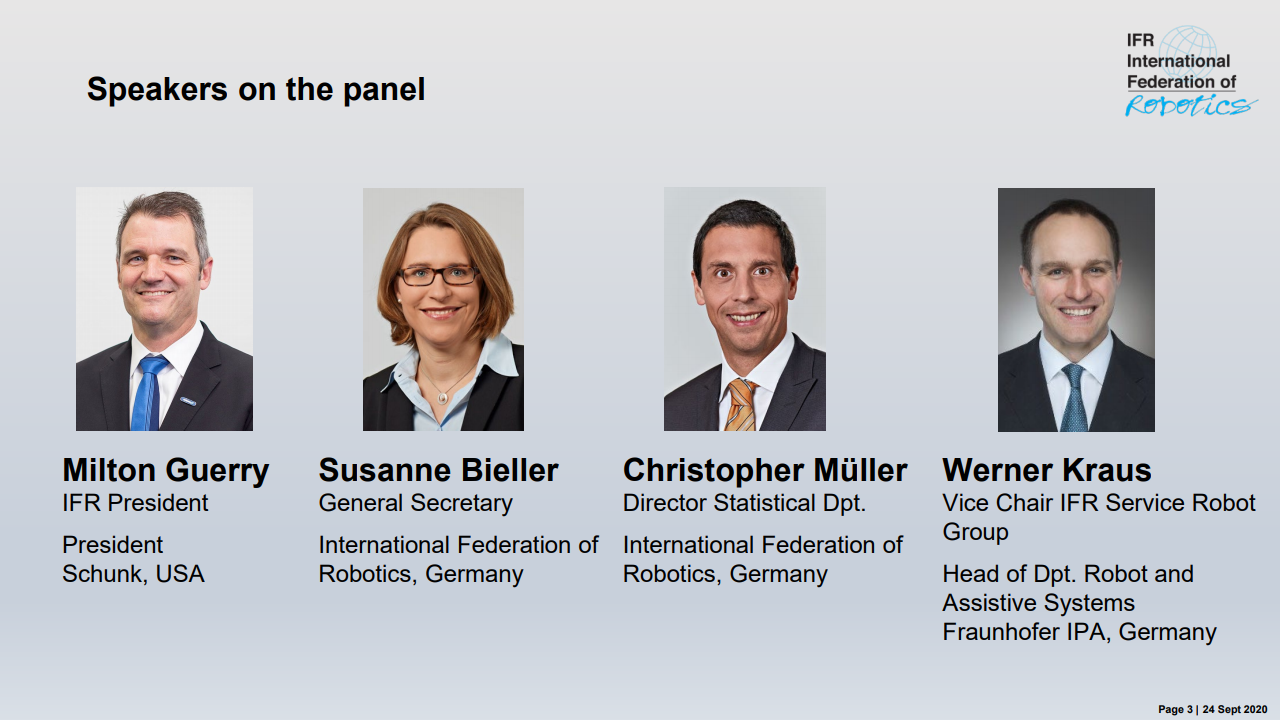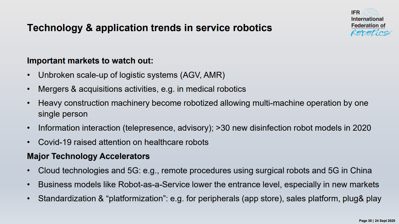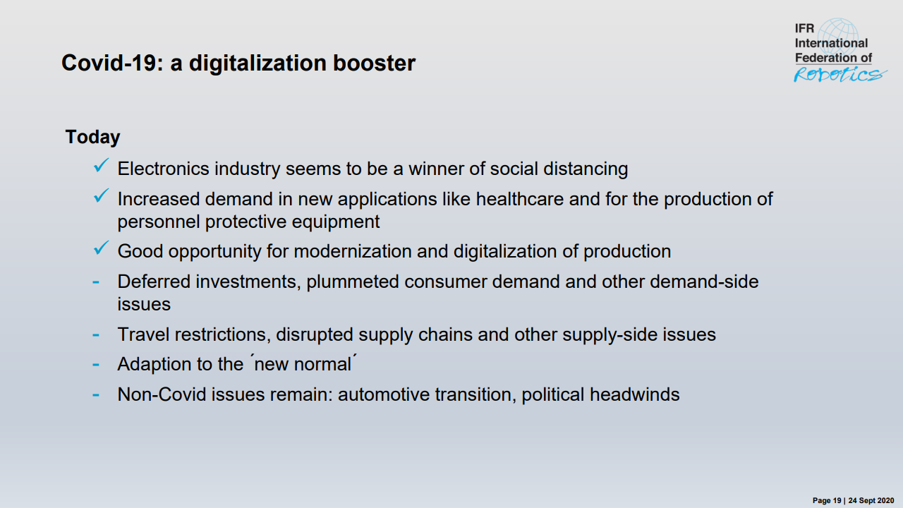 “除此之外,冠状病毒大流行对全球经济造成的后果尚无法完全评估,” MiltonGuerry说道。“ 2020年的剩余月份将取决于对“新常态”的适应。机器人供应商会适应新应用和开发解决方案的需求。今年不太可能从大规模订单中获得重大刺激。中国可能是个例外,因为冠状病毒于2019年12月在中国武汉市首次发现,该国已于第二季度开始恢复。其他经济体报告目前正处于转折点。但是,这需要几个月的时间才能转化为自动化项目和机器人需求。2021年将会恢复,但可能要到2022年或2023年才能达到危机前的水平。”