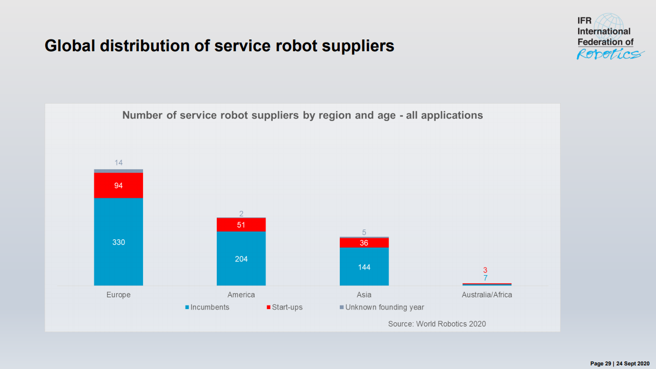 机器人销售显示出欧盟内最大市场的不同情况:德国安装了约20,500个机器人。这低于创纪录的2018年(负23%),但与2014-2016年持平。法国(+ 15%),意大利(+ 13%)和荷兰(+ 8%)的销售额上升。英国的机器人技术水平仍然很低–新安装速度下降了16%。英国新安装的2,000辆单元数比德国(20,500辆)的量少十倍,比意大利(11,100辆)的量低五倍,而法国(6,700辆)的量则低三倍。