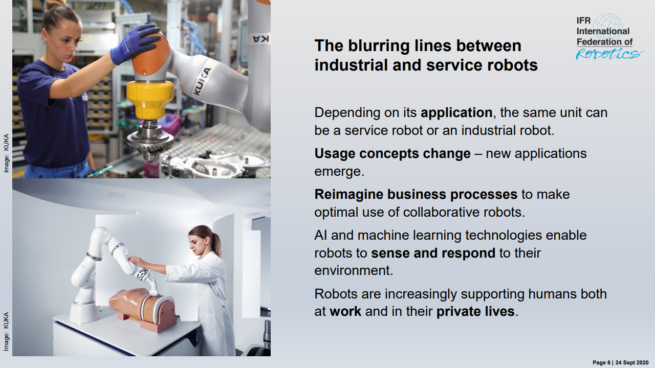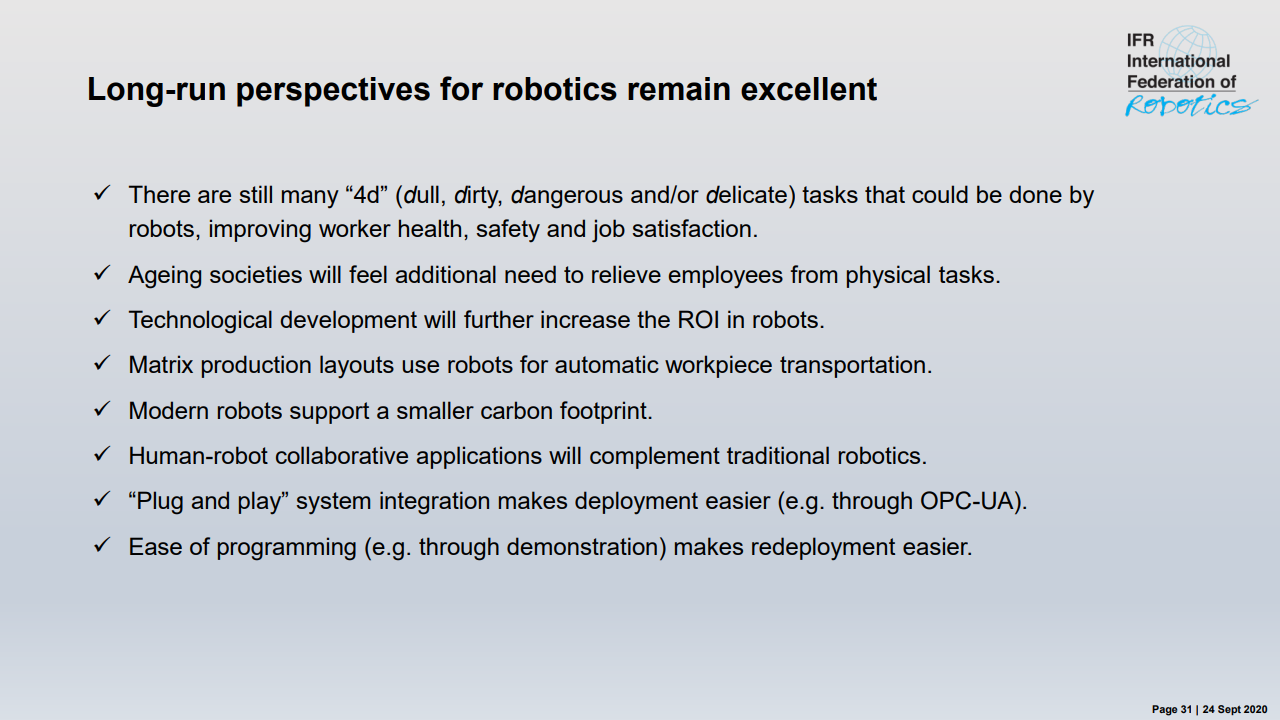 在全球范围内,COVID-19对2020年具有重大影响-但也为恢复生产的现代化和数字化生产提供了机会。从长远来看,增加机器人安装数量的好处仍然是:快速生产和交付具有竞争力的价格的定制产品是主要诱因。自动化使制造商能够在不牺牲成本效率的情况下将生产保持在发达经济体或将其转移到其他国家。工业机器人的范围不断扩大-从能够快速,精确地处理所有有效载荷的传统笼式机器人,物料搬运机器人到可以与人类安全地工作并完全集成到工作台中的新型协作机器人。