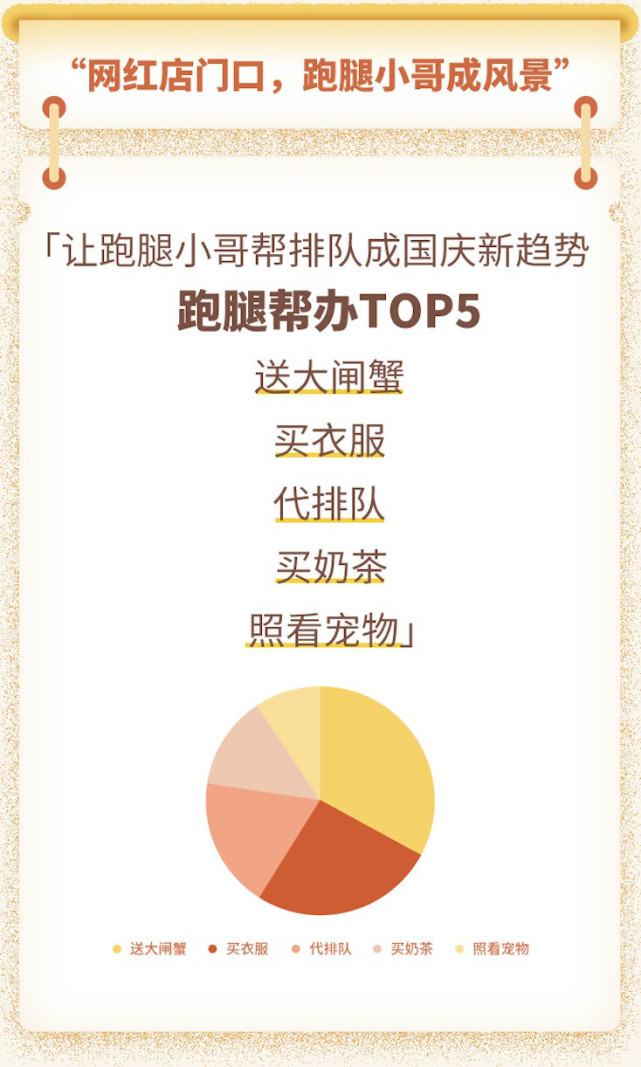 跑腿小哥是万能的。美团外卖提供的数据显示,10月1日到3日,跑腿日均订单量同比增长151%。美团跑腿小哥接到的需求既多样且个性化,送大闸蟹、买衣服、代排队、买奶茶、照看宠物等是最为普遍的需求。其中,跑腿代排队订单同比增长419%,成假日消费新趋势,90后为主要消费群体。
