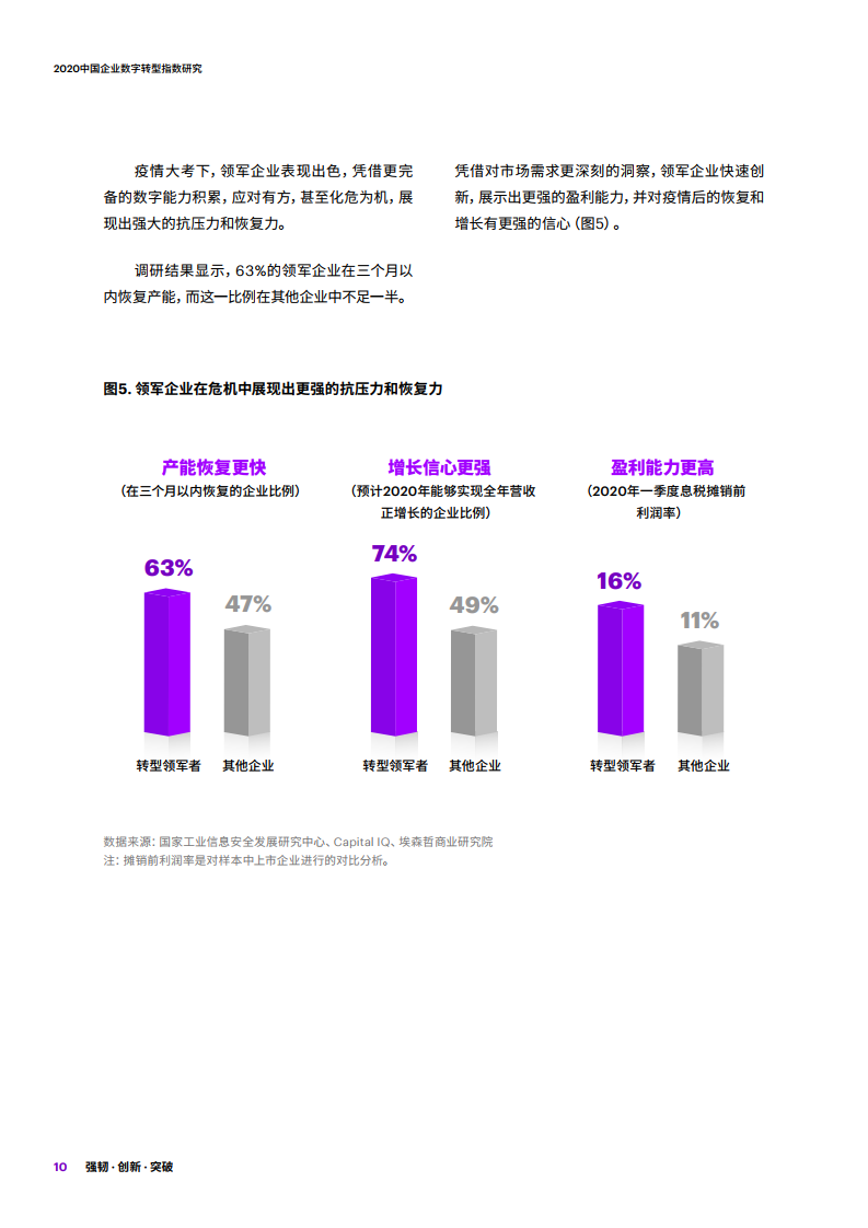 疫情大考下,领军企业表现出色,凭借更完备的数字能力积累,应对有方,甚至化危为机,展现出强大的抗压力和恢复力。调研结果显示,63%的领军企业在三个月以内恢复产能,而这一比例在其他企业中不足一半。凭借对市场需求更深刻的洞察,领军企业快速创新,展示出更强的盈利能力,并对疫情后的恢复和增长有更强的信心。