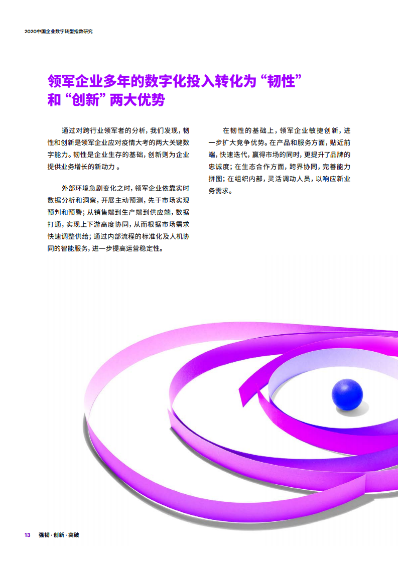 通过对跨行业领军者的分析,我们发现,韧性和创新是领军企业应对疫情大考的两大关键数字能力。韧性是企业生存的基础,创新则为企业提供业务增长的新动力 。