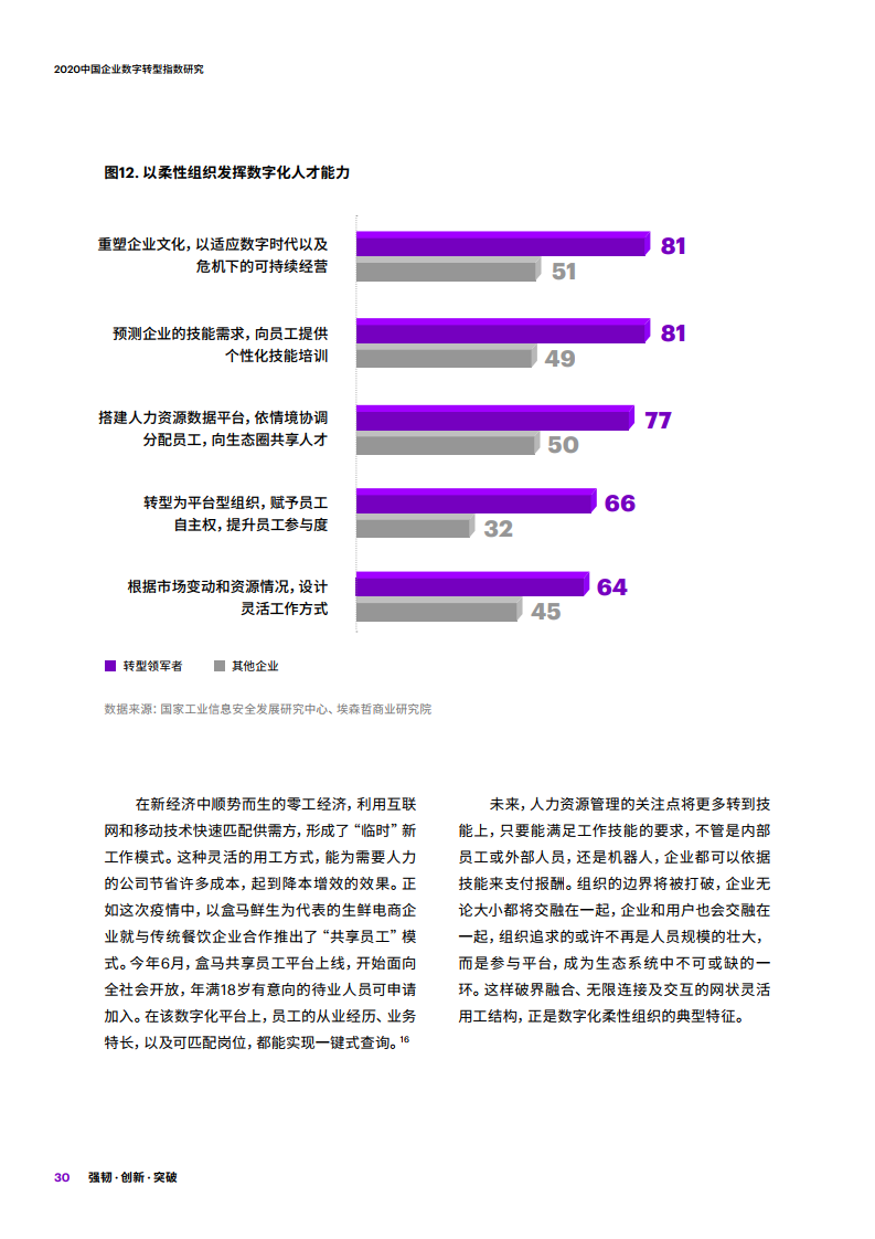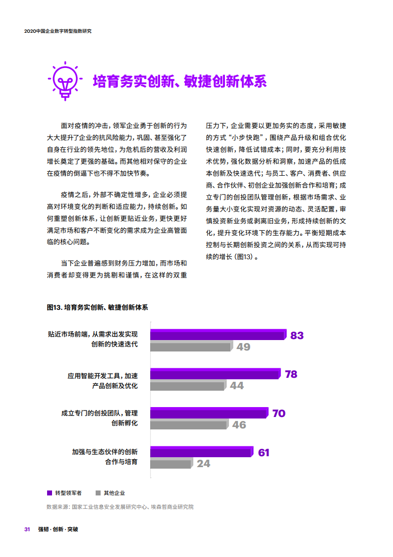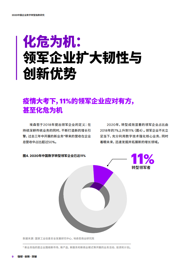 - 2020年有11%的受访企业凭借完备的数字能力,在疫情中应对有方,甚至化危为机,成为数字转型领军者。