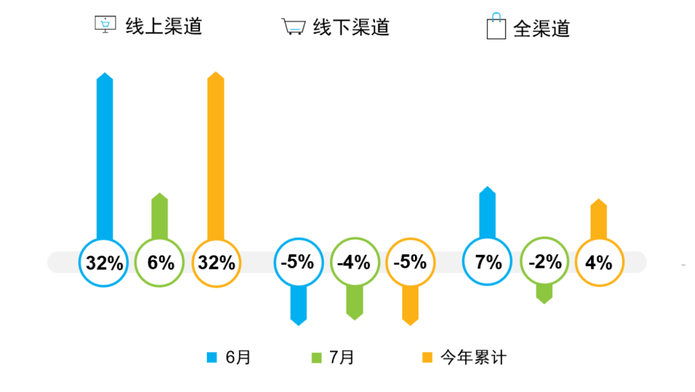 就零售业而言,复苏仍在持续,并呈现出U型走势。尼尔森研究显示,7月份快消品线上渠道销售额同比增长6%,6月份增速为32%;今年截至7月同比增长32%。7月份线下渠道销售额下降4%,降幅较6月份的5%收窄;今年截至7月同比下降5%。受线上渠道增长放缓影响,7月份快消品全渠道销售额下降2%;今年截至7月同比增长4%。