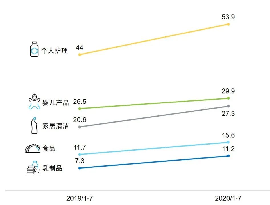 渠道方面,电商渠道的增长仍在继续,主要由于大型现代渠道的消费转移;与此同时,传统渠道的购买者则逐步转向小型现代渠道和便利店。个人护理和母婴用品依然是电商渠道收入增长的主要推动力,但食品、乳制品和家居清洁品类的线上渠道重要性也在不断提升:家居清洁的线上渠道重要性较上年同期上升近7个点,乳制品线上渠道的重要性也首次超越了10%。