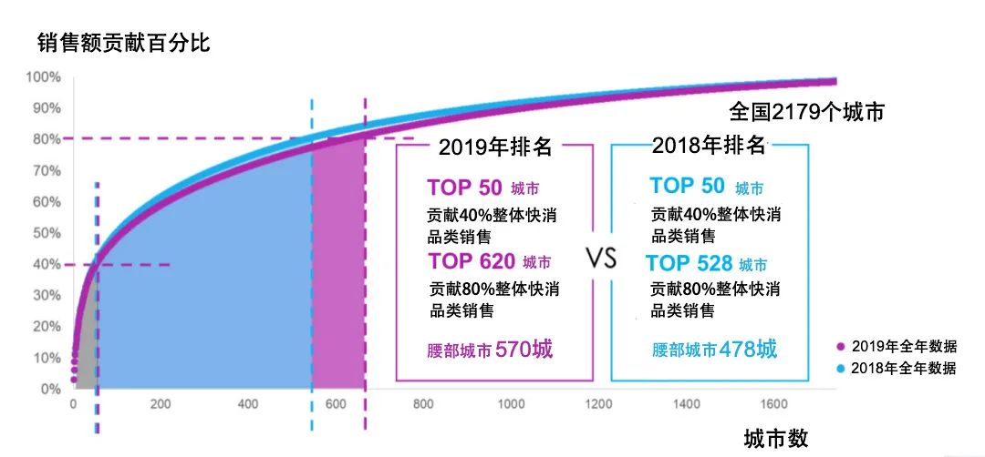 市场下沉是一个永恒的话题,在今天也越来越受到关注。但快消品销售集中度的下降,使得市场下沉越发困难。贡献40%快消品销售额的腰部城市数量由2018年的478个增至2019年的570个,表明销售集中度在下降,市场愈发分散。尼尔森首席商务官丁玎指出,“找到合适的城市作为下沉的目标市场,比以往任何时候都更加重要。如何区分城市的优先级?最有效率的门店在哪里?解答这些问题,对于抓住增长非常关键。”