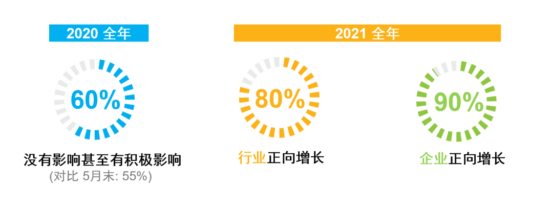 尼尔森9月份的最新研究也显示,企业管理者对企业表现的预期持续向好。在被问及如何预测疫情对企业2020年全年业绩的影响时,60%的受访管理者认为没有影响甚至有积极影响,高于5月份的55%。展望2021,80%的受访管理者预测其所在行业2021年将实现增长,90%认为其所在企业2021年将实现增长。