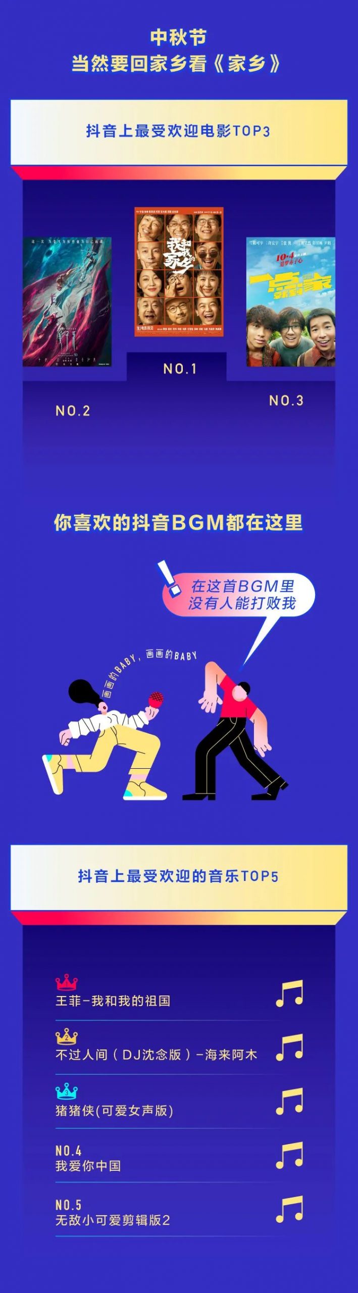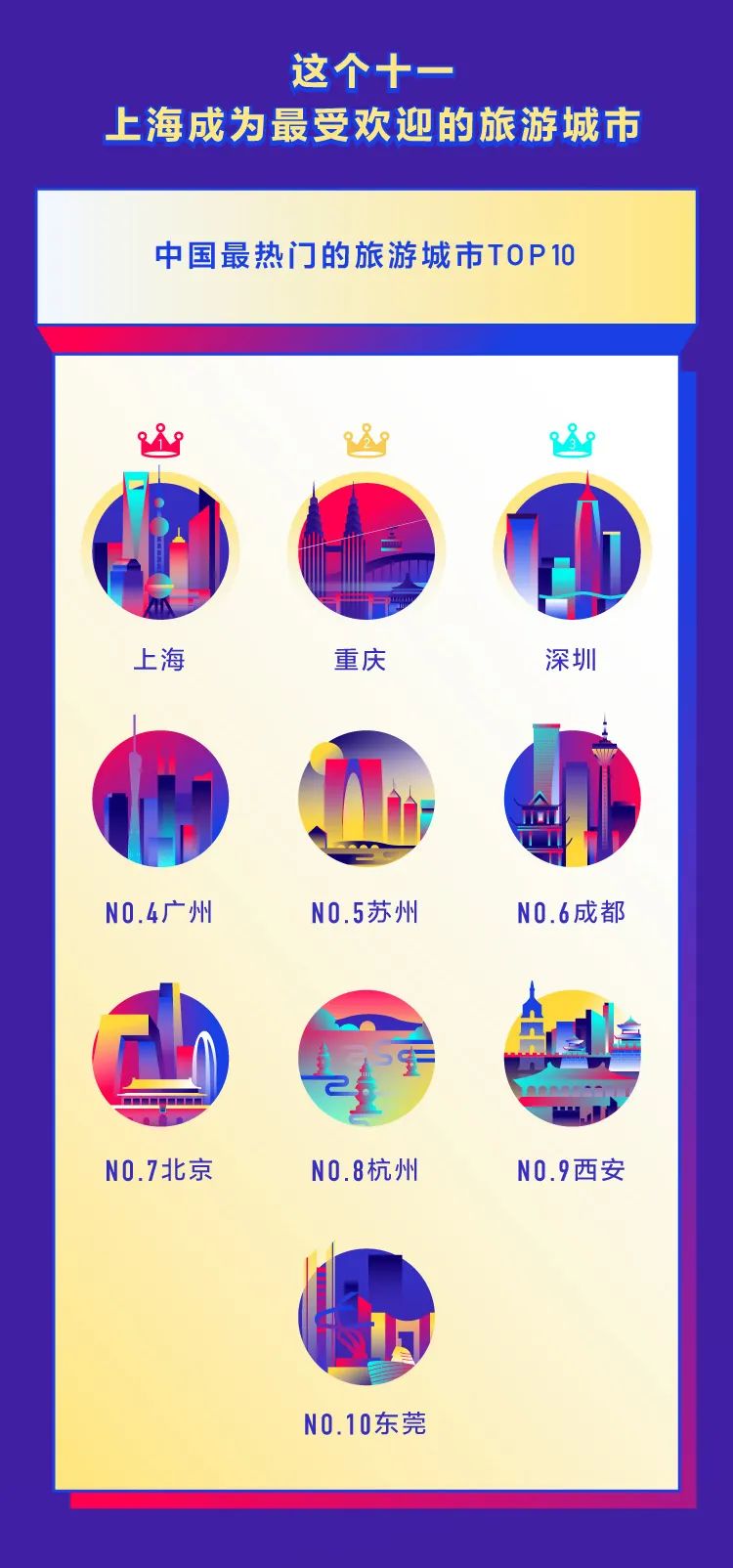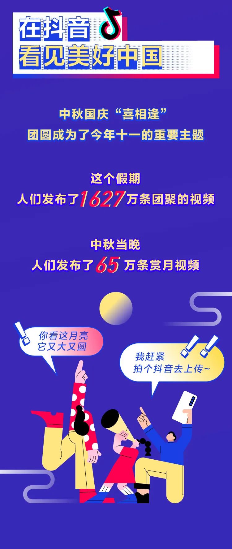 2020抖音国庆数据报告 转眼间,国庆假期又过去了。 你是不是也对2020年最后一个长假恋恋不舍? 下面就让我们用一张图记录下这个愉快的假期吧: ◎上海成为最热门的旅游城市,获赞超过4515万。 ◎苏州、东莞成为新一代热门旅游城市。 ◎杭州西湖是国内最热景点。 ◎中秋国庆双节重合,人们在抖音上分享了1627万条和家人团聚的视频。 ◎679万人在抖音的直播间里学习知识,113万人通过抖音直播间云健身。 ◎今年国庆抖音上有117万个视频,记录下了中国人婚礼的瞬间。 转自:抖音 更多阅读:2019年抖音数据报告(附完整版下载)柠檬爱美:2020中国医美用户图鉴泽平宏观:中国人口报告20202020快手电商生态报告慧数:2020车主评价白皮书凯络:2020品牌情商指数报告德勤咨询:2020千禧一代年度调研光华设计基金会:2020中国服务设计报告非洲开发银行:2020非洲经济展望报告德勤咨询:2020物业行业专题报告微博动漫:2020微博动漫白皮书数据报告:社交应用出海趋势洞察与爆量密码2020浙江省互联网发展报告能源基金会:2020中国碳中和综合报告小葫芦:2020直播电商白皮书