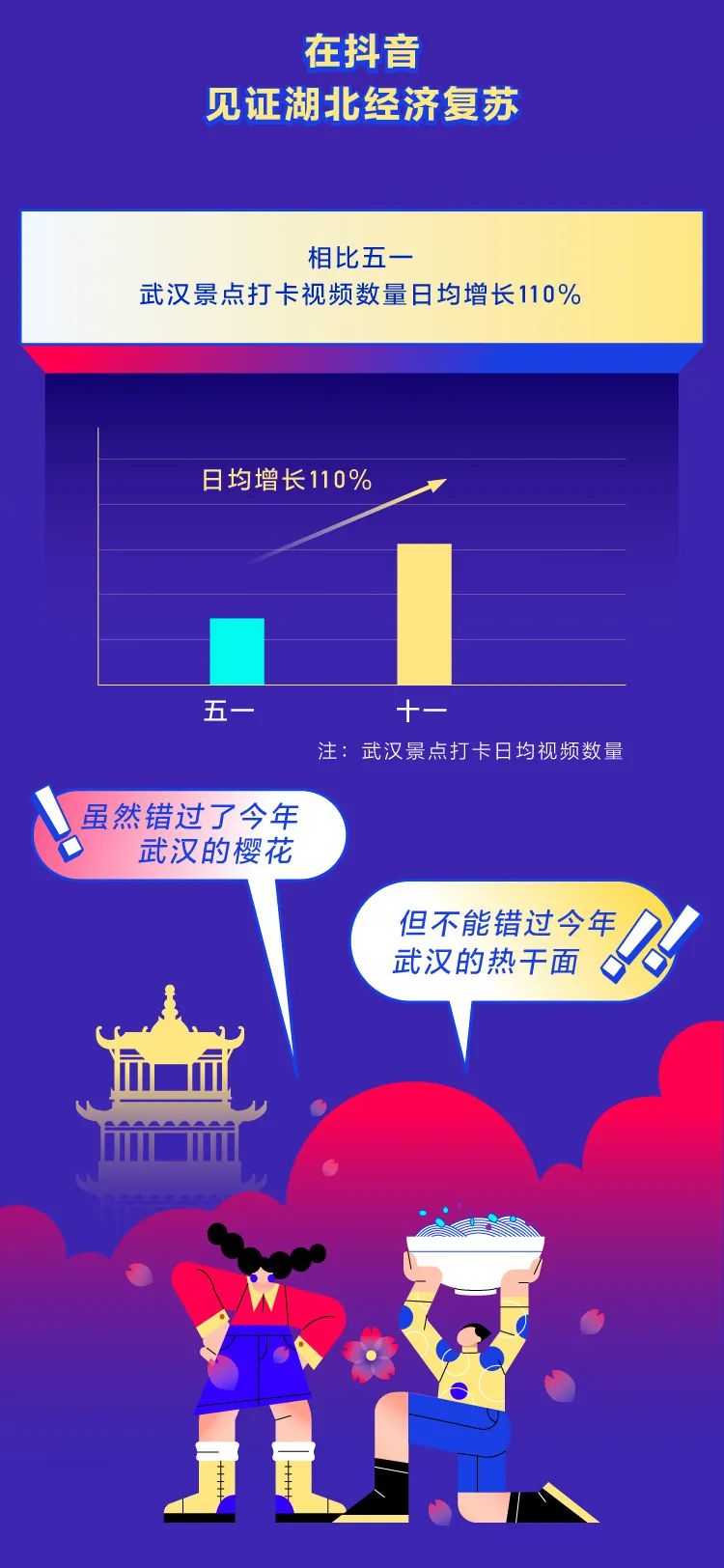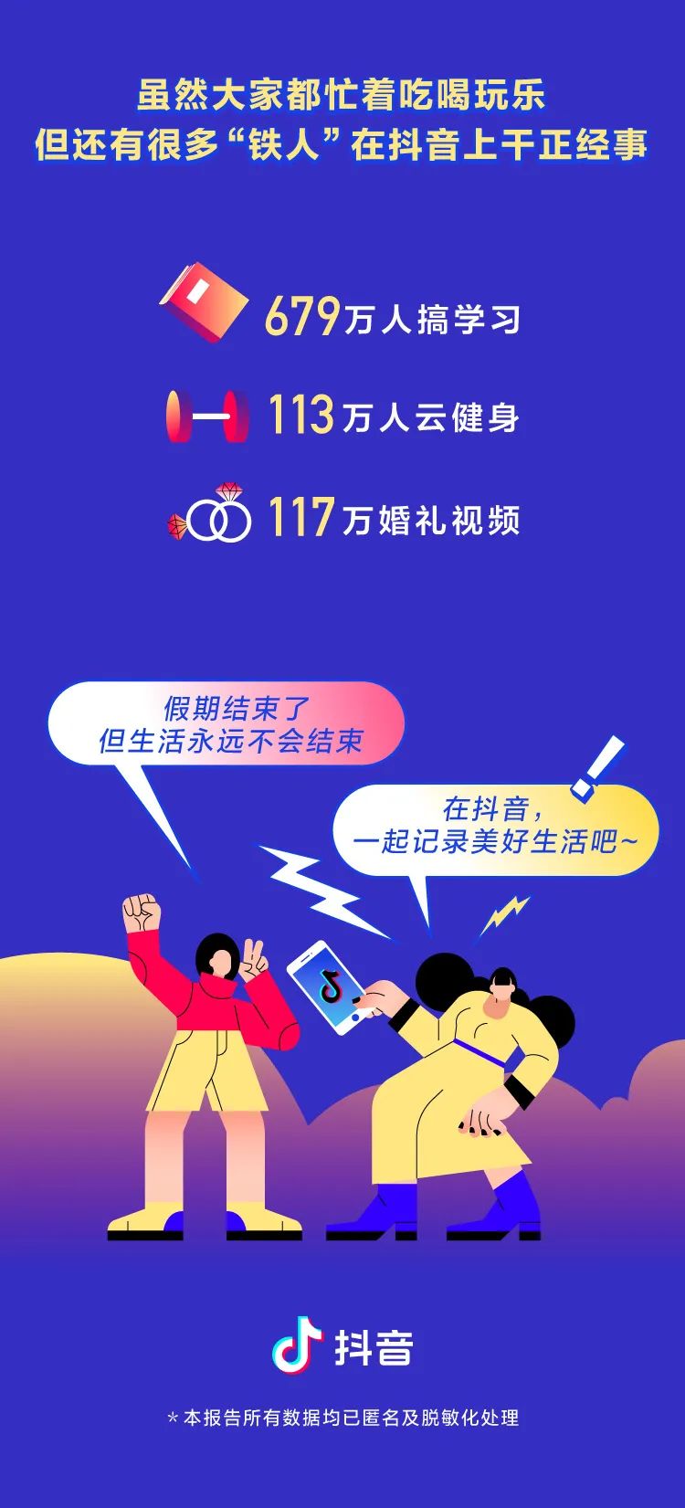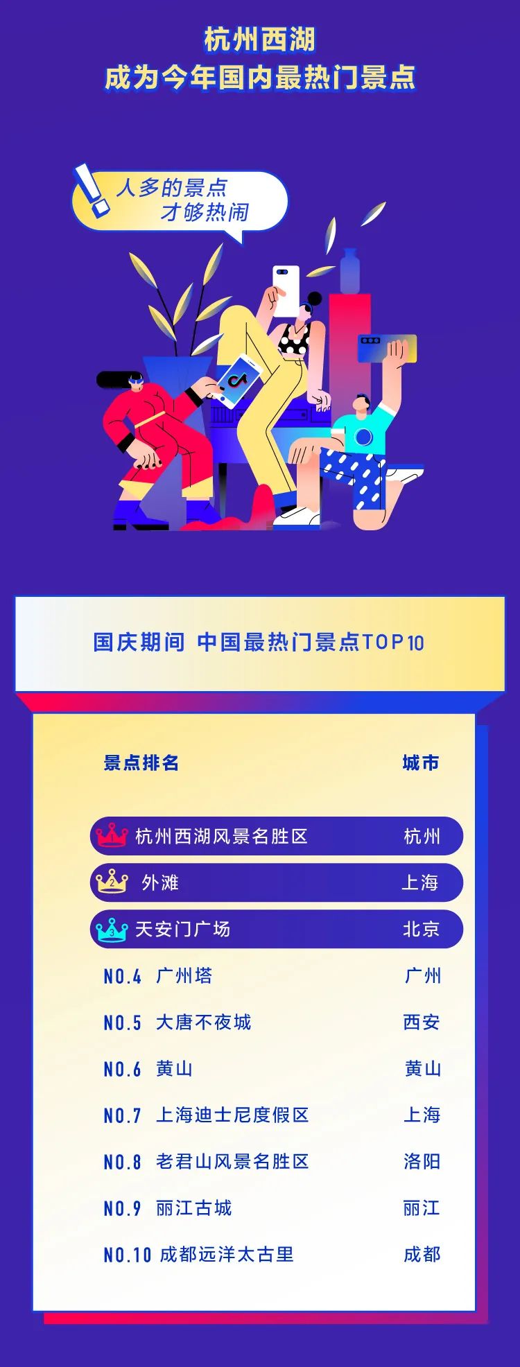 2020抖音国庆数据报告 转眼间,国庆假期又过去了。 你是不是也对2020年最后一个长假恋恋不舍? 下面就让我们用一张图记录下这个愉快的假期吧: ◎上海成为最热门的旅游城市,获赞超过4515万。 ◎苏州、东莞成为新一代热门旅游城市。 ◎杭州西湖是国内最热景点。 ◎中秋国庆双节重合,人们在抖音上分享了1627万条和家人团聚的视频。 ◎679万人在抖音的直播间里学习知识,113万人通过抖音直播间云健身。 ◎今年国庆抖音上有117万个视频,记录下了中国人婚礼的瞬间。 转自:抖音 更多阅读:2019年抖音数据报告(附完整版下载)柠檬爱美:2020中国医美用户图鉴泽平宏观:中国人口报告20202020快手电商生态报告慧数:2020车主评价白皮书凯络:2020品牌情商指数报告德勤咨询:2020千禧一代年度调研光华设计基金会:2020中国服务设计报告非洲开发银行:2020非洲经济展望报告德勤咨询:2020物业行业专题报告微博动漫:2020微博动漫白皮书数据报告:社交应用出海趋势洞察与爆量密码2020浙江省互联网发展报告能源基金会:2020中国碳中和综合报告小葫芦:2020直播电商白皮书