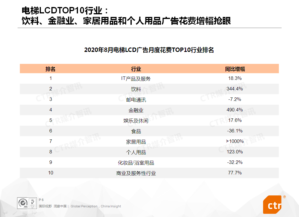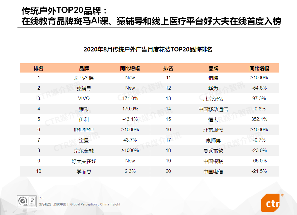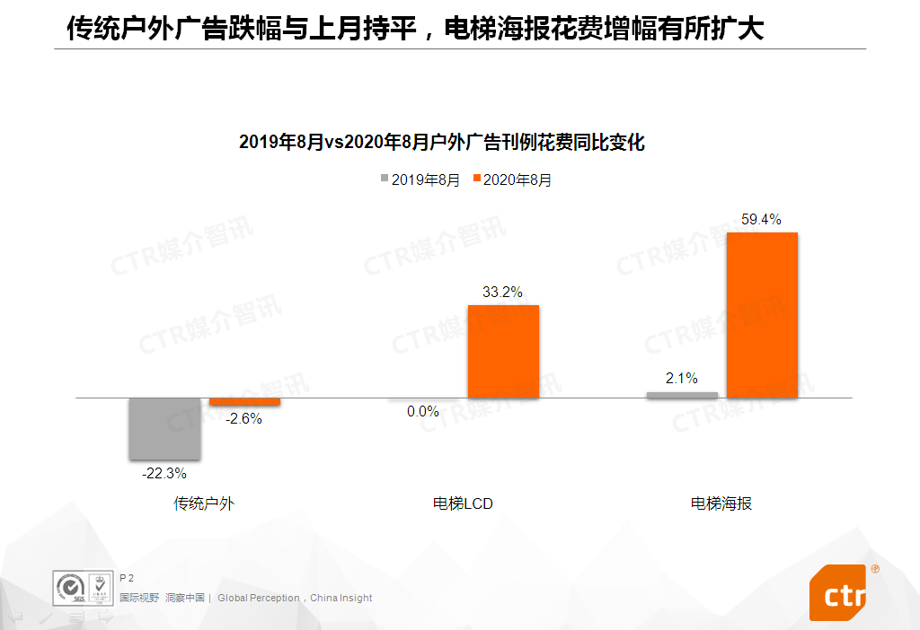 根据CTR媒介智讯的数据显示,2020年8月,传统户外广告花费同比下滑2.6%,降幅较去年同期明显收窄。电梯LCD和电梯海报广告花费增幅均达两位数,分别为33.2%和59.4%。
