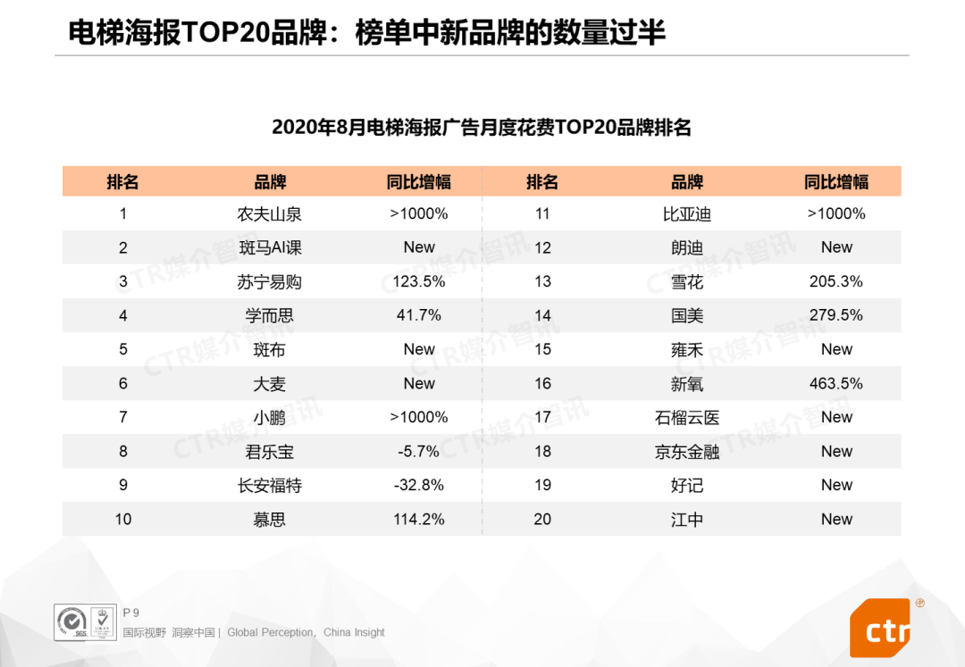 8月,IT产品及服务行业广告花费保持三位数的高增长态势,在传统户外、电梯LCD、电梯海报的花费增幅分别为177.5%、18.3%和288.0%。上月广告投放量较大的头部品牌如猿辅导、斑马AI课、新氧、学而思等依旧维持较高的花费支出,同时还得益于京东金融、好大夫在线等多个品牌的花费增投。