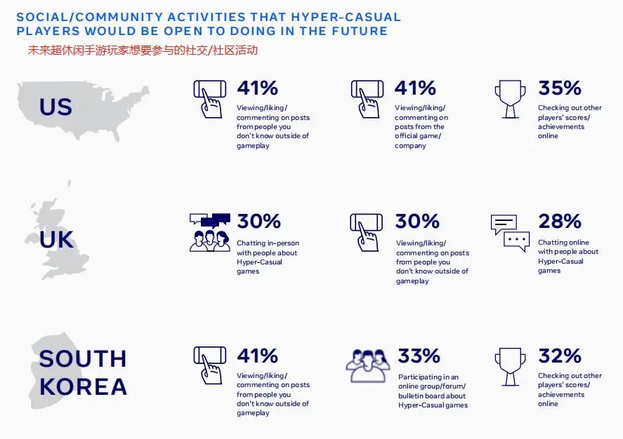 对于超休闲游戏玩家而言,在线社区成为越来越受欢迎的社区,41%的美国玩家和47%的韩国玩家每周都参与在线游戏社区。在参与社区的玩家当中,50%的美国超休闲游戏玩家称他们是为了看到娱乐玩法内容,英国49%的玩家是为了学习即将到来的更新或者游戏内容。